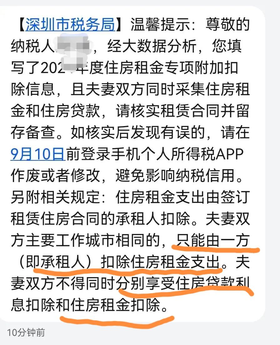 2026年个人所得税 专项附加扣除信息12月1日开始确认 和2025年没有变动的,选择“一键带入”即可,有变动的,需要单独重新填写申报,到12月31日结束。 若12月没有确认,个税的专项扣除没法逐月抵扣,到2026年3月份汇总再一次性抵扣,会影响1、2月的到手工资。 专项附加扣除,有两项夫妻两个人的要注意:“住房租金”和“住房贷款”这两项, 只能且同时由一个人去申报100%扣除,不可以一人各填一项扣除50%。 比如:夫妻两个在老家买的住房,在另一个城市打工又租了房,哪个签得租房合同,哪才可以用来抵扣个税。 而“住房贷款”,却可以由夫妻任何一方去申报抵扣个税,个人所得税APP上也有明确说明,夫妻双方不得同时分别享受“住房贷款”和“住房租金”扣除。 以往可能有些夫妻各自都申报了,没有收到税务局的通知,那是运气好,大数据没筛查出来。 一旦筛出来,纳税所在地的税务局会短信通知:“大数据采集信息发现,夫妻两个申报这两项有冲突,请及时修改。” 看到信息要赶紧修改,至于要不要补税看个人情况而定,不修改的后果,1、会产生泄纳金。2、影响夫妻两人征信 另外,在本地有房,但为了方便孩子上学又租了一套,也不可以填“房屋租金”。小孩今年上的大学,要重新申报“子女教育”那项,选“一键带入” 后会提示:子女教育信息已失效。 个人所得税退税 个人所得税退税,你退了吗