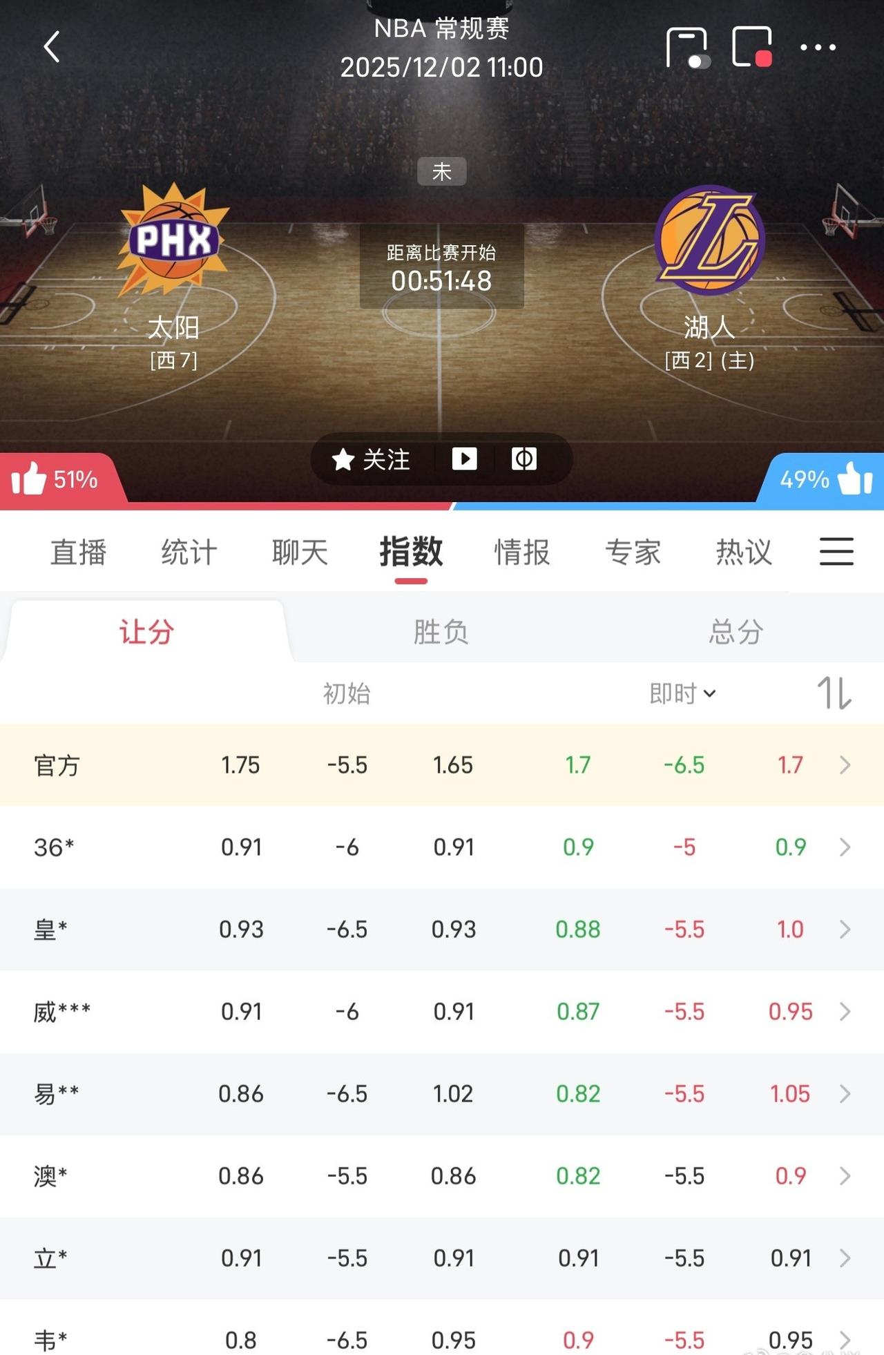 詹姆斯今日回归继续出任首发,而斯马特将继续缺阵。 不过市场给湖人胜率并不高,略低