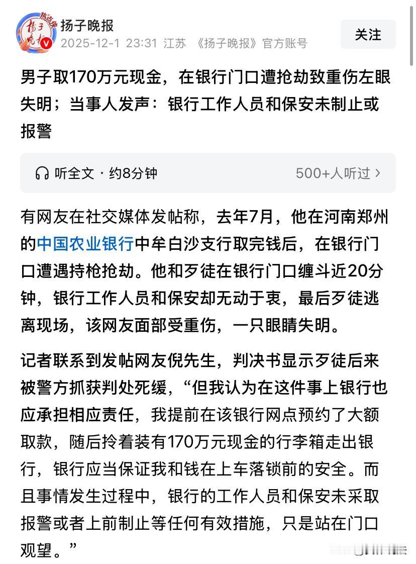 河南郑州,一男子提前预约去银行取了170万元现金,结果刚出门准备上车时,就遇到歹徒持枪抢劫。男子与歹徒缠斗了将近20分钟,最终保住了现金,但也被歹徒打成重伤左眼失明。事后,歹徒被抓住,并被判死缓。但是男子难以释怀,表示事发时,银行工作人员和保安只是在门口观望,连个报警电话也都没帮打!认为银行应该承担责任! 据悉,去年7月初,倪先生因急用钱向预约了大额取款业务。 7月2日11点,倪先生在银行办理完取现业务,拎着装有170万元现金的行李箱走出银行。 谁料,刚走出银行,走到银行门口路边停放的车前,就被一名手持自制枪支的歹徒袭击。 随后,倪先生见对方抢走行李箱就跑,没跑就不就摔倒在地,便趁机上前压住对方,而后与对方发生撕扯。 歹徒随后挣脱骑摩托车逃离现场。 倪先生的钱最终是保住了,但是也被对方打成重伤左眼失明。 事发当日,歹徒便被警方抓获。 警方查明歹徒系因生意失败及期货赔钱无力承担债务,才产生了抢劫银行取款人的念头。之所以选择涉案银行是因为离家较远,歹徒事发前曾在涉案银行及另一银行附近多次蹲点,事发当日再次在涉案银行附近蹲点时,恰巧遇到倪先生。 抢劫属于重罪且是行为犯,《刑法》第263条的规定,无论抢劫数额大小,只要实施了以暴力、胁迫或者其他方法抢劫公私财物的行为,就构成抢劫罪,应当处3年以上10年以下有期徒刑,并处罚金。 而其中具有持枪抢劫、或者抢劫致人重伤、死亡的等任一情节之一的,更是面临严惩,处10年以上有期徒刑、无期徒刑或者死刑,并处罚金或者没收财产。 倪先生作为受害人,依法还可以提起刑事附带民事赔偿,要求歹徒赔偿医疗费等等损失,案件处理中,倪先生也向歹徒提出了38万元的索赔。 法院审理后,最终以构成抢劫罪,判处涉案歹徒死缓,不过仅支持了倪先生其中7.3万余元的索赔。 事后,倪先生难以释怀,表示事发时,在银行门口与歹徒缠斗了将近20分钟,银行的工作人员和保安都看见了,但是都只是在门口观望,连一个报警电话都没帮打,还是其他在银行办理业务的人帮忙打的报警电话。 认为自己提前预约大额取现,拎着装有170万元现金的行李箱走出银行。银行应当保障自己上车落锁前的安全。自己被歹徒抢劫袭击遭受重伤,一只眼睛因此失明,银行也应当承担一定的责任。 有记者关注到此事,向涉案银行了解情况,不过并未得到正面的回复,而针对大额取现安保问题,涉事银行客服称总行无明确指引,需结合网点实际情况;多家银行也表示无统一规定。 那从法律上该如何看待此事呢?发生这样的事情银行要不要承担责任呢? 如果涉案银行针对大额取现存在相应安保规定,或者承诺,涉案银行安保人员未尽到相应的职责,涉案银行肯定是要承担相应的责任。 而根据《民法典》第509条规定,当事人应当按照约定全面履行自己的义务。当事人应当遵循诚信原则,根据合同的性质、目的和交易习惯履行通知、协助、保密等义务。 即便涉案银行没有针对大额取现存在相应安保规定,或者承诺,笔者认为,基于大额取现这一交易本身的特点,涉案银行也应当提供相应的安保服务。 另一方面来说,《民法典》第1198条第1款规定,宾馆、商场、银行、车站、机场、体育场馆、娱乐场所等经营场所、公共场所的经营者、管理者或者群众性活动的组织者,未尽到安全保障义务,造成他人损害的,应当承担侵权责任。 从法律上来讲,银行门口区域属于银行经营场所的延伸,即便涉案银行没有提供安全义务,在发现歹徒抢劫储户时,也应当伸以援手。 涉事银行没有为大额取现客户提供安保义务也就罢了,在看到客户受到侵害时,视而不见,无动于衷!还属于未尽安全保障义务的情形,从这个角度来说,银行也需要承担责任! 不过应当注意的是,《民法典》第1198条第2款规定,因第三人的行为造成他人损害的,由第三人承担侵权责任;经营者、管理者或者组织者未尽到安全保障义务的,承担相应的补充责任。经营者、管理者或者组织者承担补充责任后,可以向第三人追偿。 也就是说像本案这样存在第三人侵权的,银行在未尽到安全保障义务的情况下,只承担补充责任。 而所谓的补充责任是指是指在第一顺位责任人的财产不足给付时,由第二顺位责任人在不足的范围内予以补充的法律责任。 具体到本案,也就是说倪先生只能在歹徒无法履行7万余元赔偿义务的范围内,要求银行赔偿。 这事您怎么看?欢迎在评论区留言,与大家一起交流您的看法! ------ 关注@安律说法 案例中看人生百态,法律中寻破局之法!