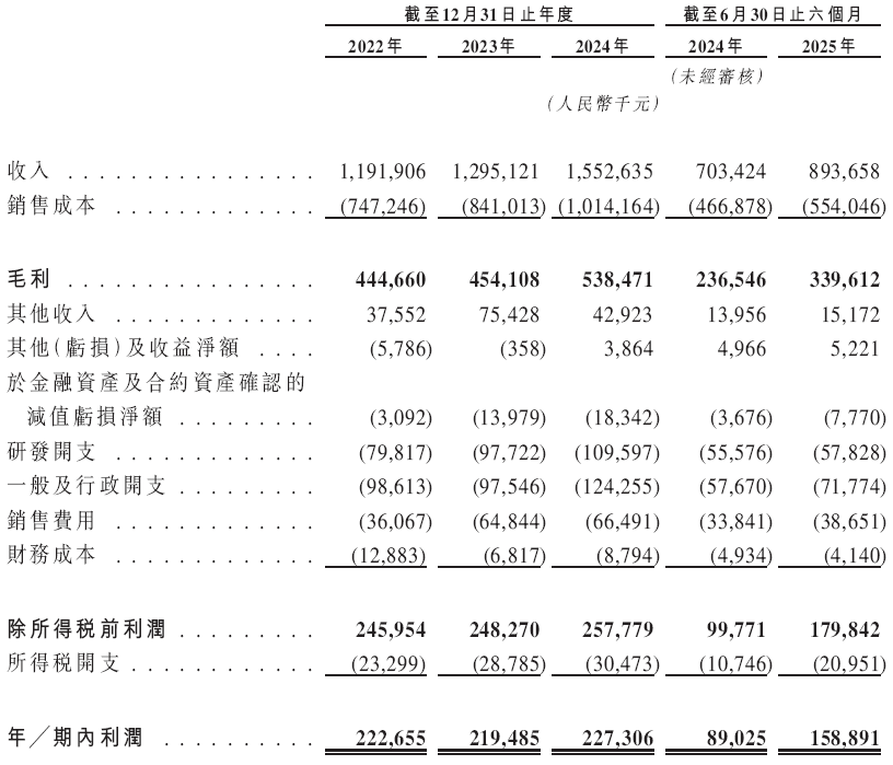 招股书显示,在过去的2022年、2023年、2024年和2025年前六个月,鼎泰高科的营业收入分别为人民币11.92亿、12.95亿、15.53亿和8.94亿元,相应的净利润分别为人民币2.23亿、2.19亿、2.27亿和1.59亿元。