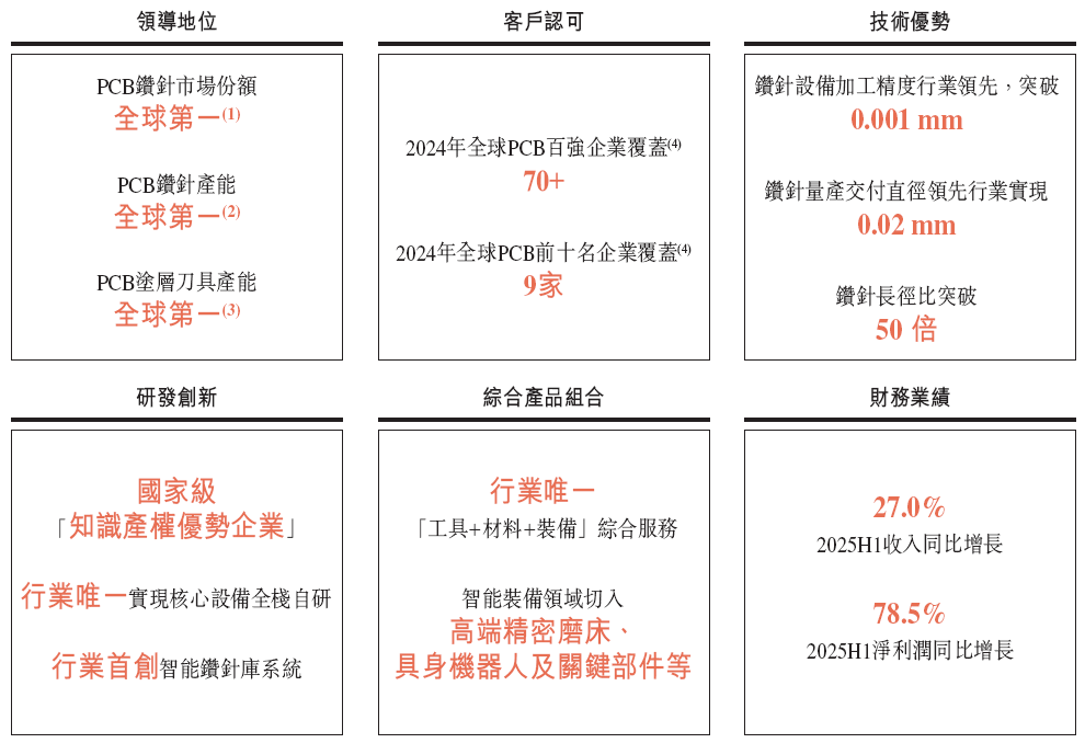 根据弗若斯特沙利文的数据,于往绩记录期间(2022年、2023年、2024年及2025年前六个月)按销量计,鼎泰高科为全球最大的钻针供货商。按2024年及2025年前六个月销售量计,鼎泰高科在PCB钻针生产商中排名第一,全球市场份额分别为26.8%及28.9%。