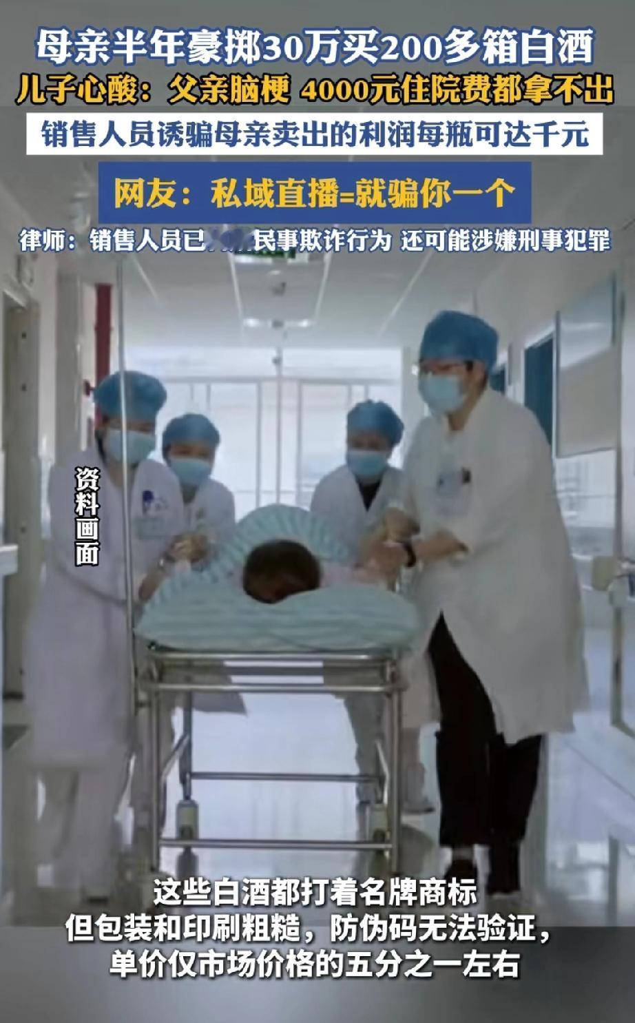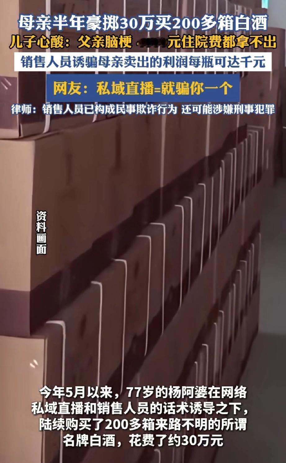 上海有位77岁的阿婆,痴迷于“私域直播”,半年时间,就花30万买了200箱白酒。老伴突然急症住院,阿婆连4000元住院费都拿不出,儿子这才发现阿婆买酒之事。 儿子回到家,只见杂物间里堆满了白酒。阿婆解释道:“销售人员跟我说,这些都是名酒,每箱酒卖出去能赚一千多块呢。” 然而,儿子看到白酒的包装箱粗糙简陋,防伪二维码也扫不出来,明显是冒名的假酒。 阿婆买的这些酒,比市场正品的价格低了五分之一,而且是货到付款,根本查不到卖家的具体信息,想维权也无从下手。 私域直播,指的是企业或个人在自有流量池(微信群、企业微信、小程序等)针对已建立联系的特定用户群体开展的互动营销直播活动。 有网友评论,阿婆遇到的这场直播,就是专门针对她一人设下的骗局。 近年来,不少老年人即便年逾花甲,仍怀揣着赚钱的梦想,可这份期待却被骗子利用,最终使自己陷入被骗的境地。 活在当下,安享晚年,健康平安远比金钱重要!不贪图小利,就不会上当受骗,骗子再精明也是徒劳,守住老本才能心安! 别让“赚钱”成为执念,谨记:不贪小利,才不会吃大亏! 来源:海报新闻