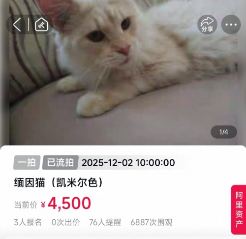大皖新闻讯12月2日,大皖新闻记者从阿里资产平台看到,一只凯米尔色缅因猫因为无人出价,一拍流拍。起拍价4500元,吸引了6000多人次围观,三人报名竞拍,但均未出价。