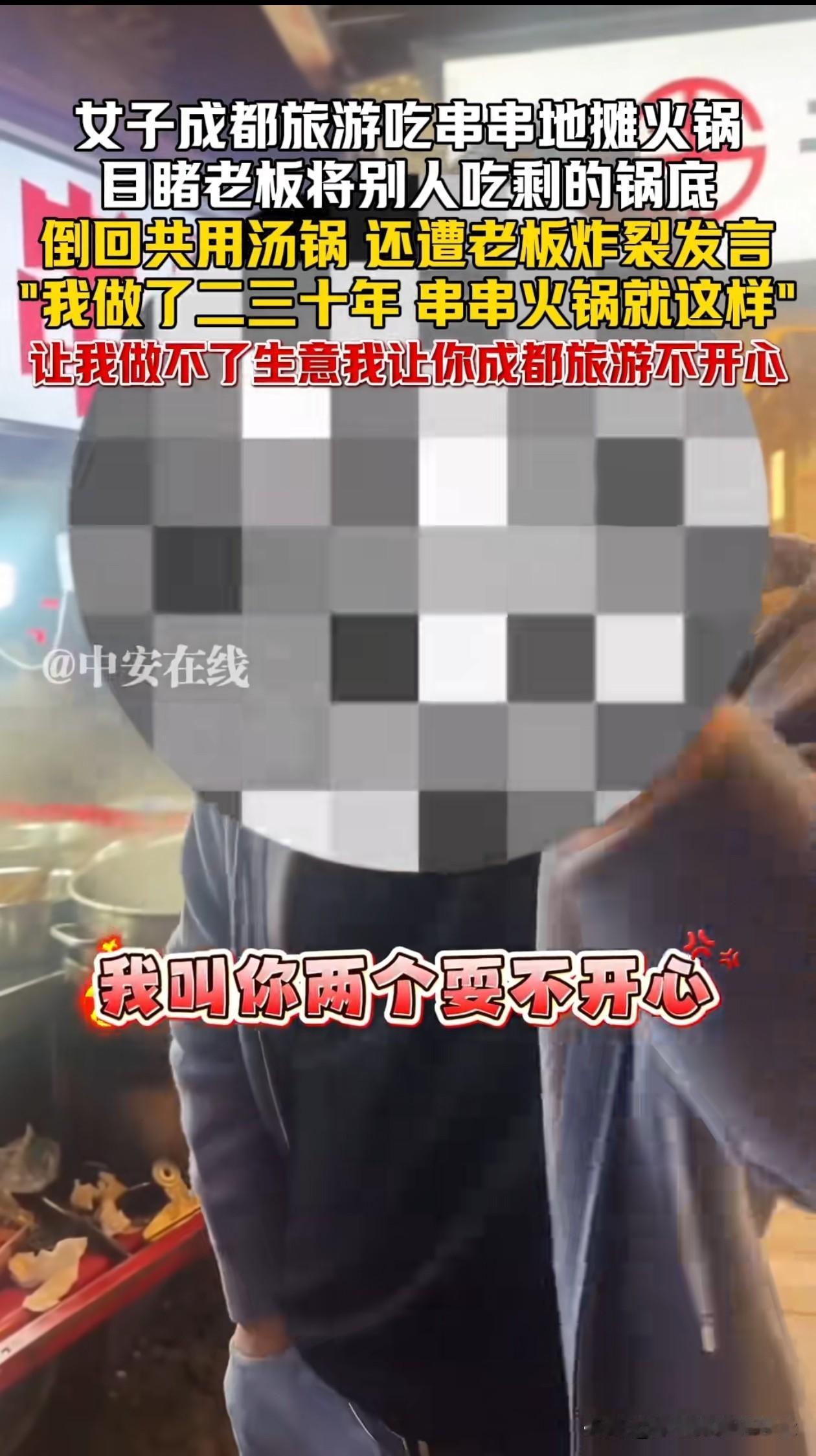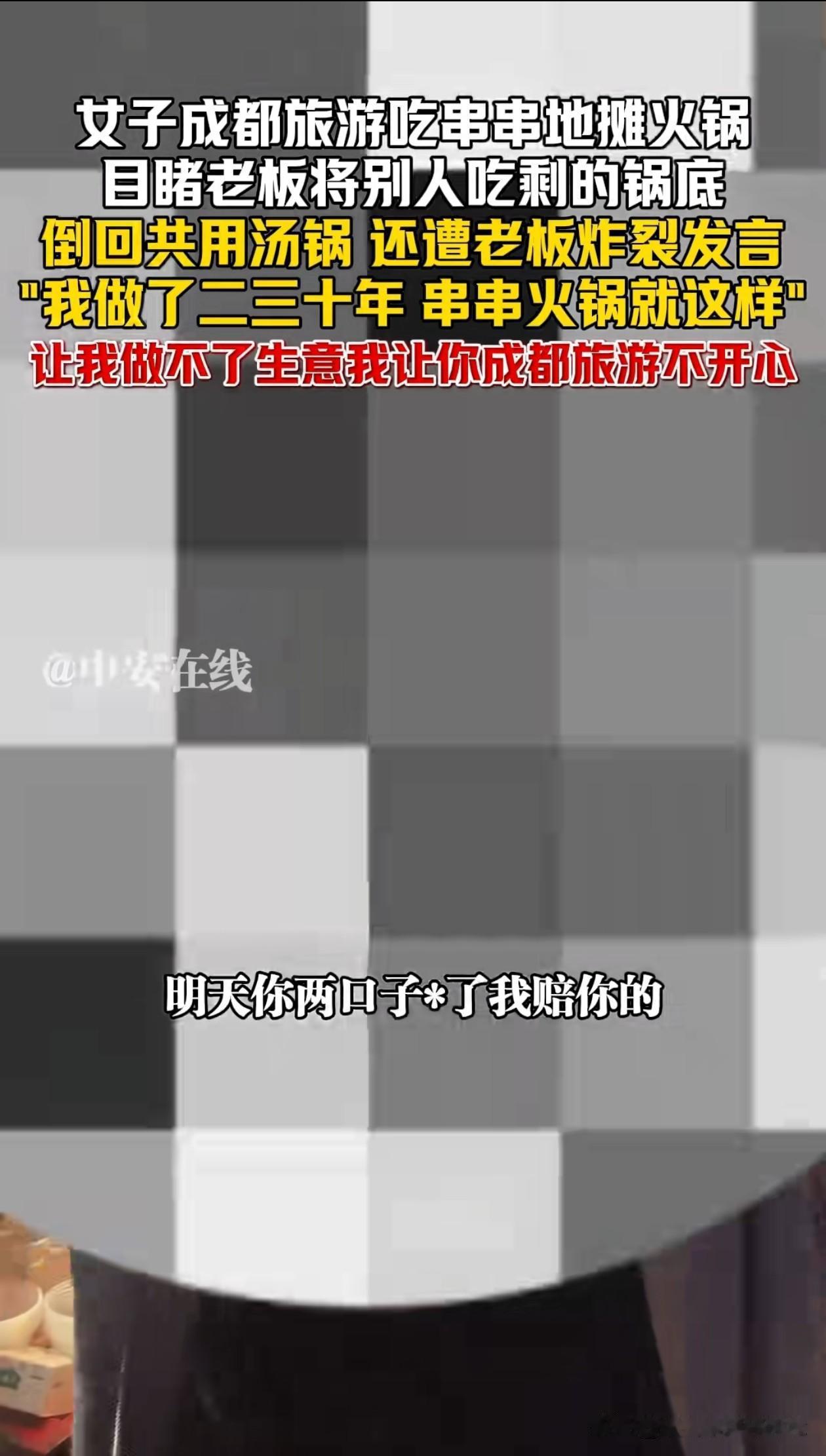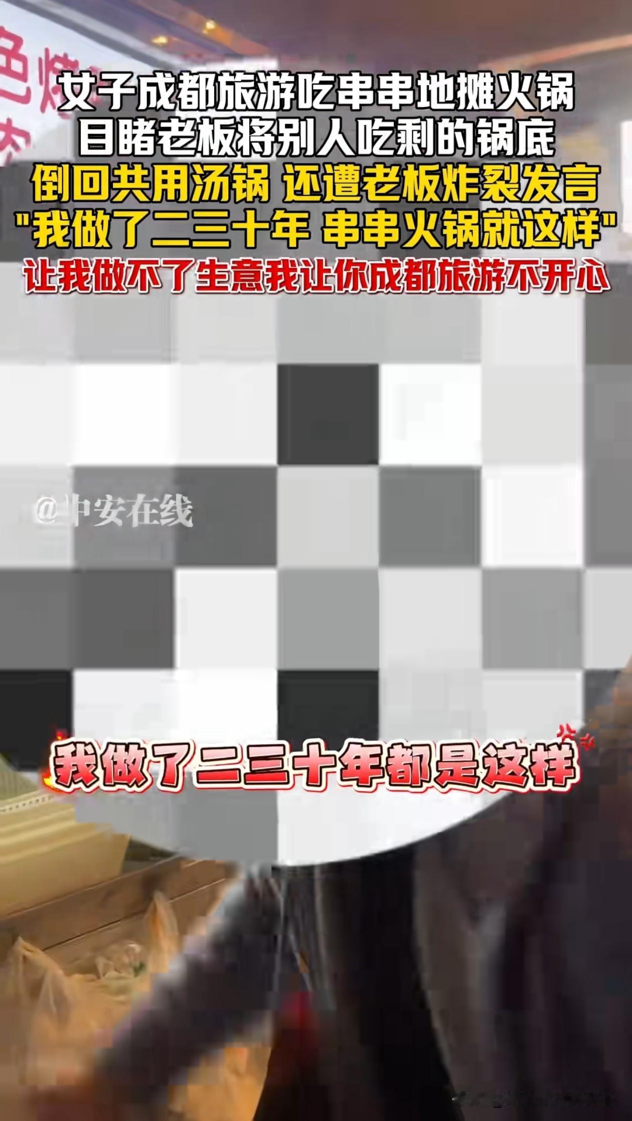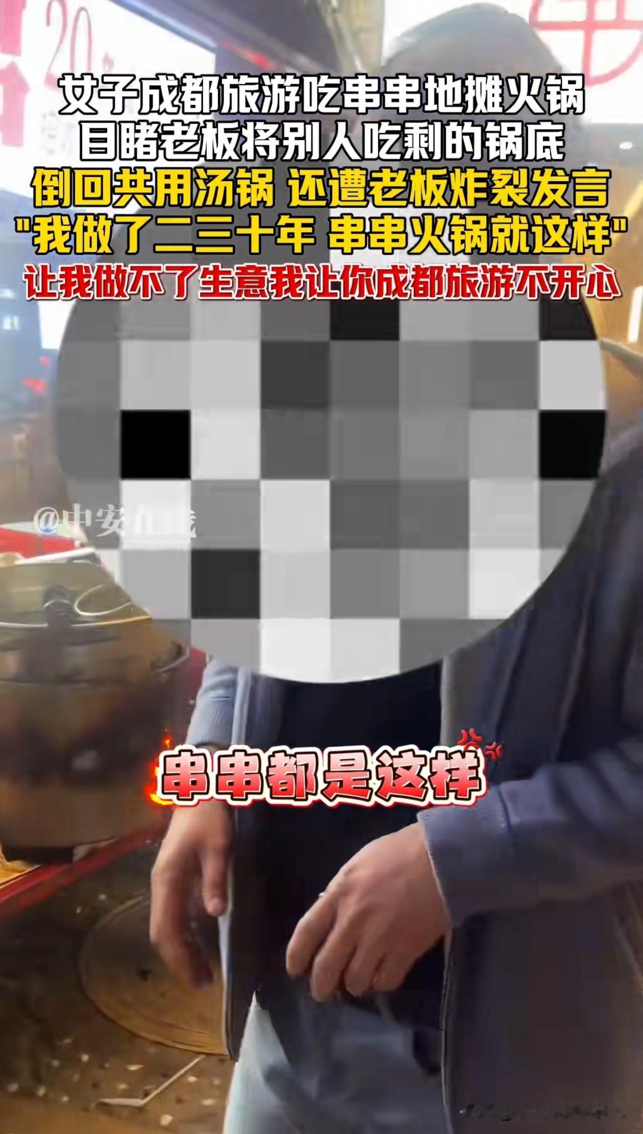 成都的朋友们, 来说说这事是真是假。 一女子在成都旅游吃串串地摊火锅,亲眼看见老板把别人吃剩的锅底倒回共用汤锅。 近日,一女子去成都旅游时,看见串串店老板把别人吃过的锅底倒入锅里二次利用,女子拍下视频曝光老板的行为,没想到,老板的回复也很炸裂。 老板说:“串串都是这样”,“你叫我今天没法做生意,我叫你两个耍不开心。”老板说自己做了二三十年生意,都是这么做的,人在外地人不习惯。还承诺明天要是这两人si了,他负责赔偿。 我也去过成都,喜欢吃成都的火锅,串串,但是真的没见过直接把吃过的锅底再倒回去二次利用的。也许可能是没当着我的面这么做吧。 评论区很多四川网友都说确实会倒回去,还说老油吃着香,老火锅就是这样。说实话,我们尊重每个地方的饮食习惯,但老油和“回收别人吃剩的锅底”根本不是一回事啊! 老油是正经熬煮后滤渣提纯的,可把别人吃剩下的汤汤水水直接倒回共用汤锅,既并不能代表成都火锅的行业规范吧,还可能是一种违法违规行为。 说真的,成都好吃的火锅串串遍地都是,绝大多数老板都靠味道和口碑正经做生意,这位老板的操作和态度也太让人下头了,威胁游客更是离谱。 出门旅游吃美食本来是开心事,遇到这种事真的太影响心情了。有没有成都本地的朋友或者近期去过成都吃串串的朋友,来说说你们遇到过这种情况吗?你们觉得这种“回收锅底”的操作真的普遍吗? 串串地摊火锅