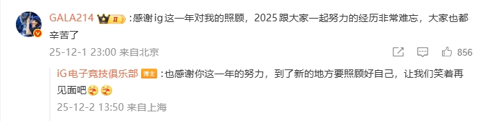 GALA:“感谢iG这一年对我的照顾,2025跟大家一起努力的经历非常难忘,大家也都辛苦了。”