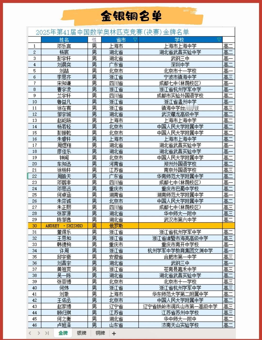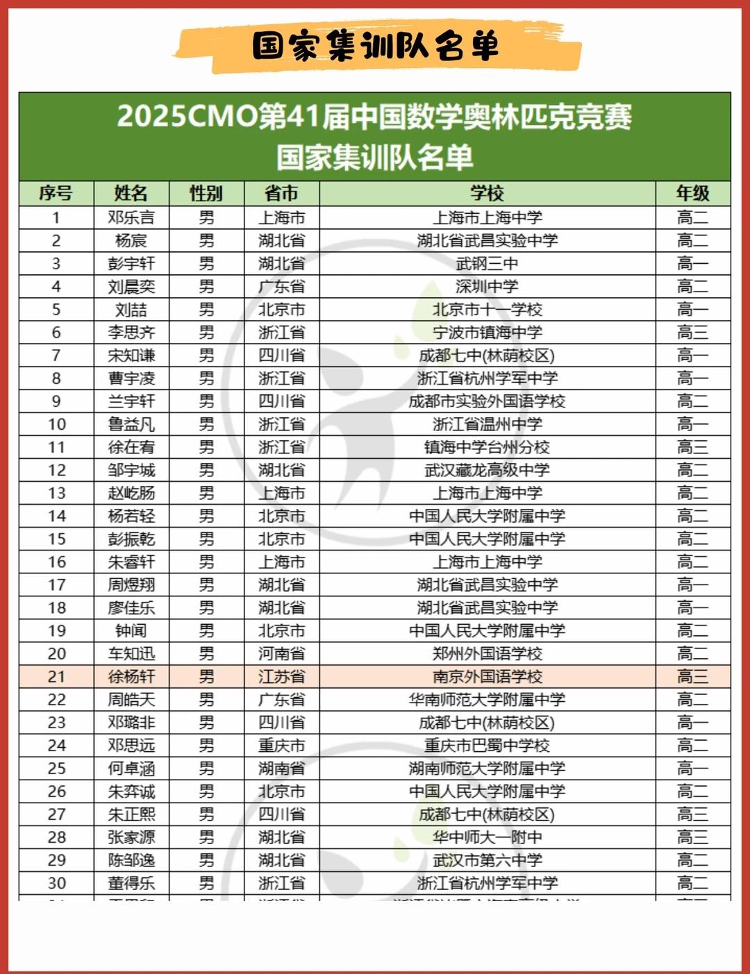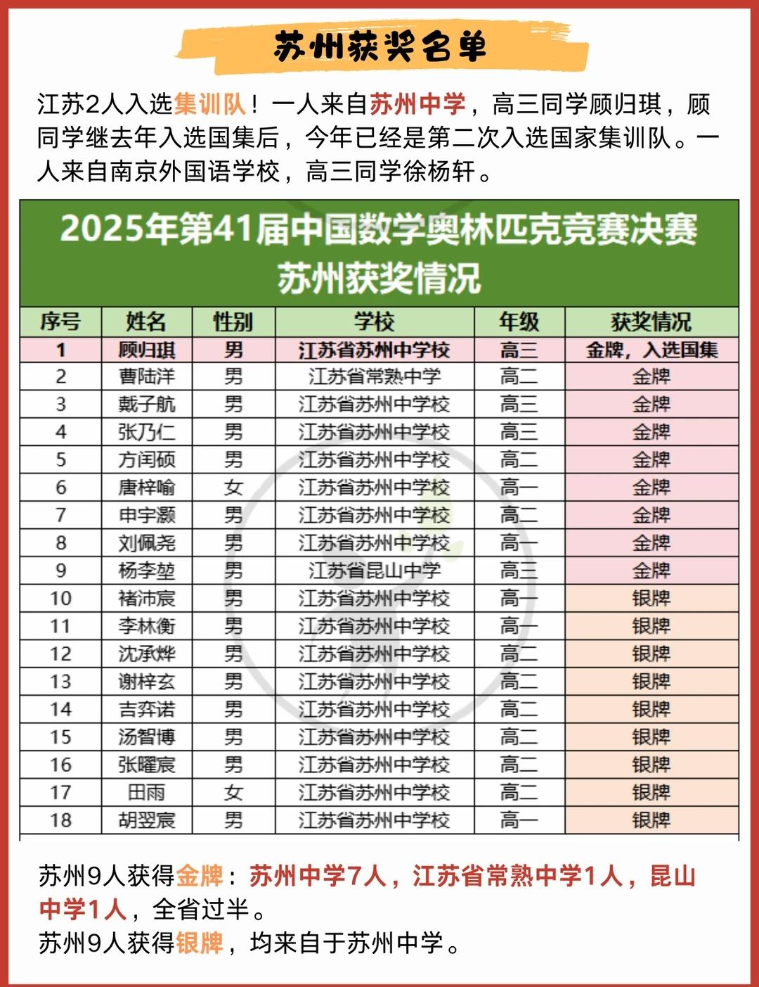 苏州1国集9金9银!2025数竞决赛获 奖名单 2025年第41届全 国中学生数学竞赛决赛国集、金银铜牌获 奖名单出炉,恭喜各位同学! 江苏2人入选集训队!一人来自苏州中学,一人来自南京外国语学校,一起来看! 苏州中学 昆山中学 常熟中学 苏州 江苏竞赛 数学竞赛 五大学科竞赛 江苏高中