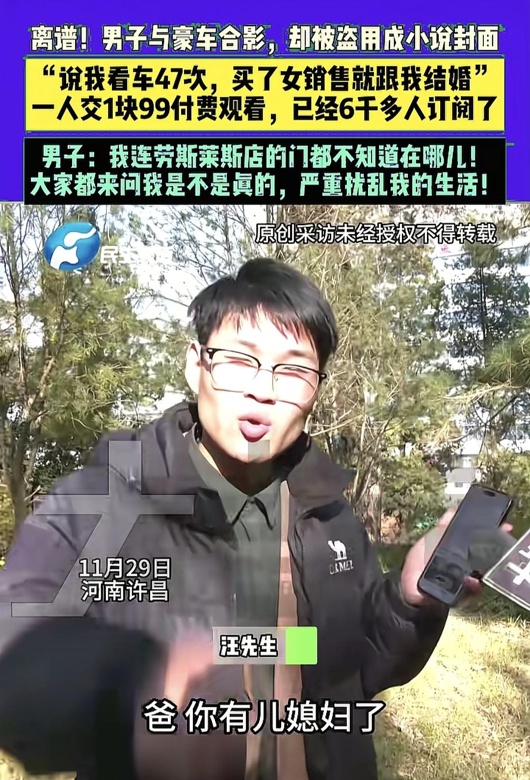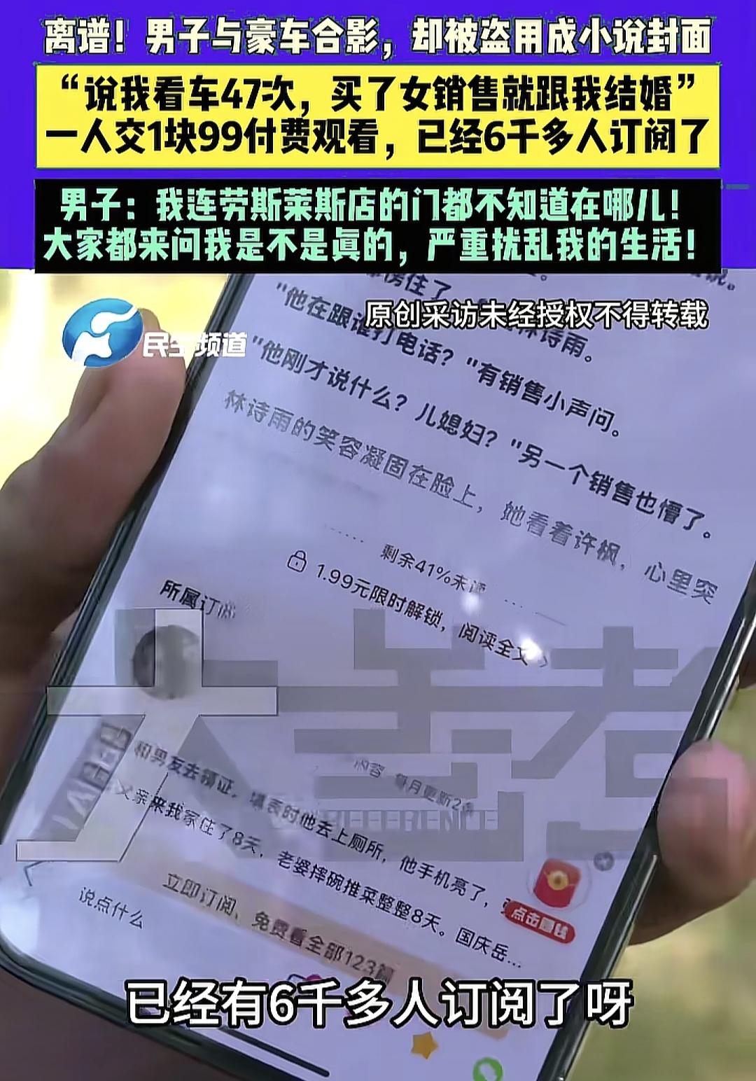 “笑不活了!”河南许昌,男子与豪车拍了照片,却被人盗用做了小说封面,标题说:“小伙看车37次,女销售调侃,买车就跟你结婚”,还弄成1.99元付费观看,有人看到问男子是不是真的?男子一看已有6000多人订阅了,气的他直跳脚。 河南许昌的汪先生最近有点烦,不是工作上的事,也不是家里的事,而是一张年初和朋友劳斯莱斯的合影,把他搅得不得安宁。   这事说起来挺离奇,他到现在跟人聊起,还忍不住皱着眉头吐槽。   汪先生在本地社交平台有十几万粉丝,平时发点生活日常,互动一直不错。   大概半个月前,他突然收到好几个粉丝的私信,问他“汪哥,劳斯莱斯开着是不是特得劲?”   一开始他没意识到问题,之前自己在社交平台上发过自己和朋友的劳斯莱斯的合影,以为是粉丝开玩笑,还认真回复“那车是朋友的,我哪买得起”。   可架不住问的人越来越多,还有朋友专门打电话来调侃“可以啊老汪,藏得够深,靠爹买车娶媳妇都不跟我们说”。   汪先生这才觉出不对劲,追问之下才知道,有本付费小说用了他那张合影当封面。   那小说标题写得煞有介事:“小伙月薪4826元,去看劳斯莱斯37次,女销售调侃,你买我就跟你结婚,小伙歪嘴一笑:爸,你有儿媳妇了”。   他赶紧按朋友说的去搜,一看到那本小说,气就不打一处来。   封面确实是他的照片,只是脸上被打了层模糊的马赛克,他说这马赛克还不如不打,看着跟自己犯了啥错似的,熟人一眼就能认出是他。   更让他哭笑不得的是小说里的设定,他感觉全是槽点,一直接连不断地和找来的记者吐槽。   什么一个月看37次劳斯莱斯,自己朋友的劳斯莱斯自己也开过,再馋也不能天天跑店里去看啊。   还有听到女销售说“你买我就跟你结婚”,然后歪嘴一笑的情节,汪先生更是感觉自己的形象全毁了。   最离谱的是,这小说还是付费的,想看他“到底娶没娶女销售”的后续,得花1.99元解锁,页面显示已经有6000多人付了费,观看量更是达到3.7万。   汪先生对着手机直叹气:“合着编我瞎话还得我花钱看?我自己都想知道最后娶没娶成”。   因为粉丝多,这事儿在本地传得挺快,亲戚、同事轮番来问,他每天都要重复好几遍“车是朋友的,故事是编的,把我卖了都买不起劳斯莱斯”。   他先试着联系小说作者,可消息根本发不出去,只能发一条私信,之后就石沉大海。   没办法,他只好向小说平台举报,还联系了媒体,平台客服说可以通过作者主页的举报功能反馈,会有专人核实处理,但截至目前还没收到明确答复。   这种事不是个例,现在不少爽文作者为了省事儿、博流量,就靠“开局一张图,内容全靠编”。   他们觉得普通人的肖像没那么金贵,打个马赛克就万事大吉,却不知道只要照片能被熟人识别,就算侵权。   要是真遇到汪先生这种情况,别慌着解释,先截图留证,联系作者和平台要求下架,不行就走法律途径,毕竟肖像权受法律保护,不是谁想用就能用的。