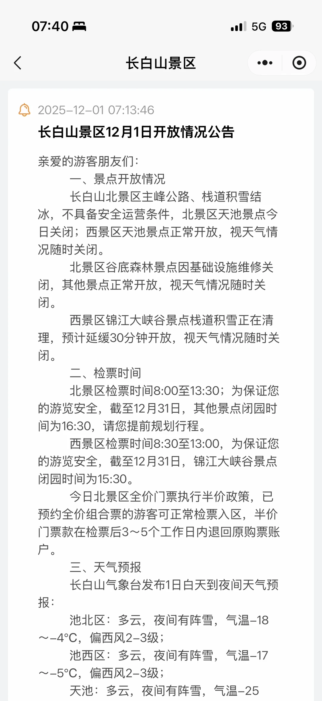 本来最有希望的长白山北景区今天最有希望开,无奈昨晚下了一场大雪!
