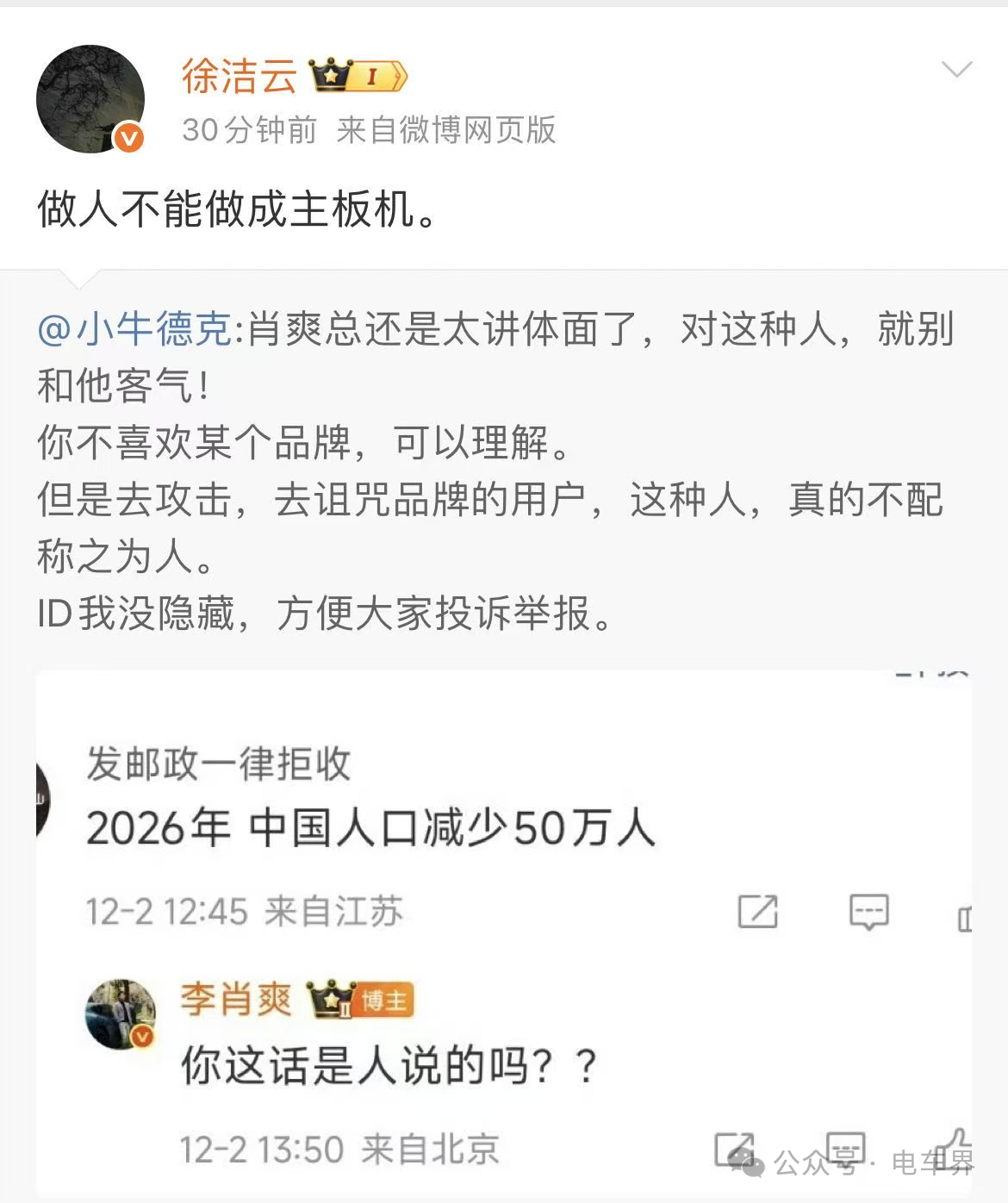 博主小牛德克表示:“肖爽总还是太讲体面了,对这种人,就别和他客气!你不喜欢某个品牌,可以理解。但是去攻击,去诅咒品牌的用户,这种人,真的不配称之为人。ID我没隐藏,方便大家投诉举报。”
