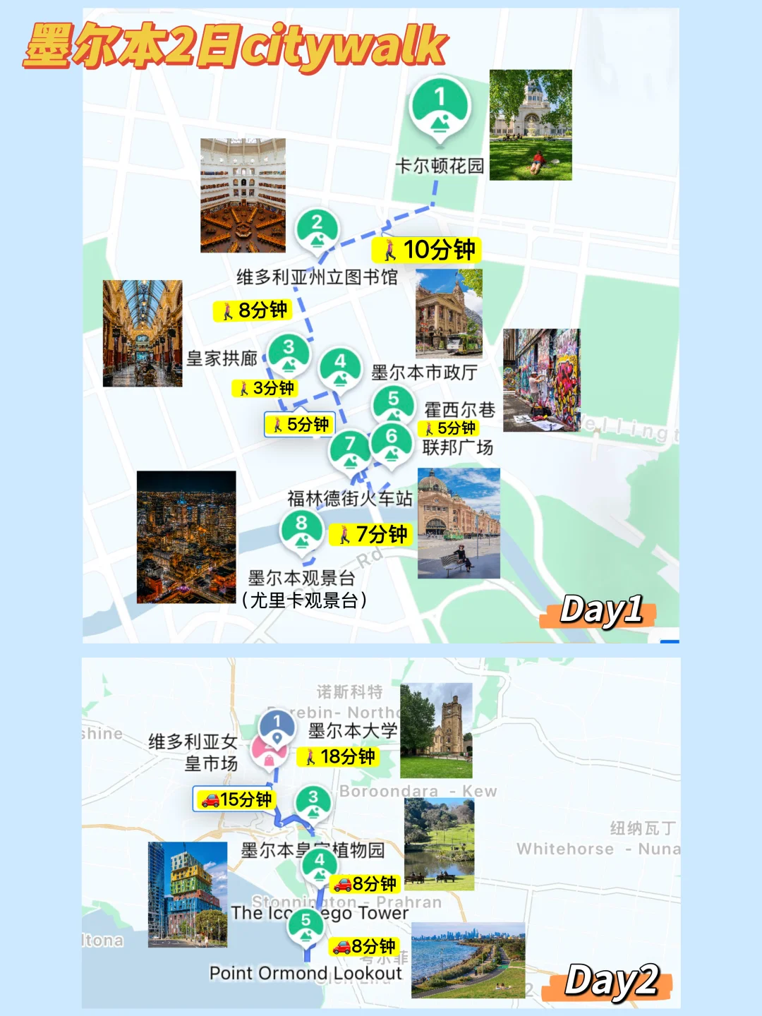 1️⃣墨尔本市区的打卡点距离都很近,每站步行5-10分钟就到了,半天就能逛完