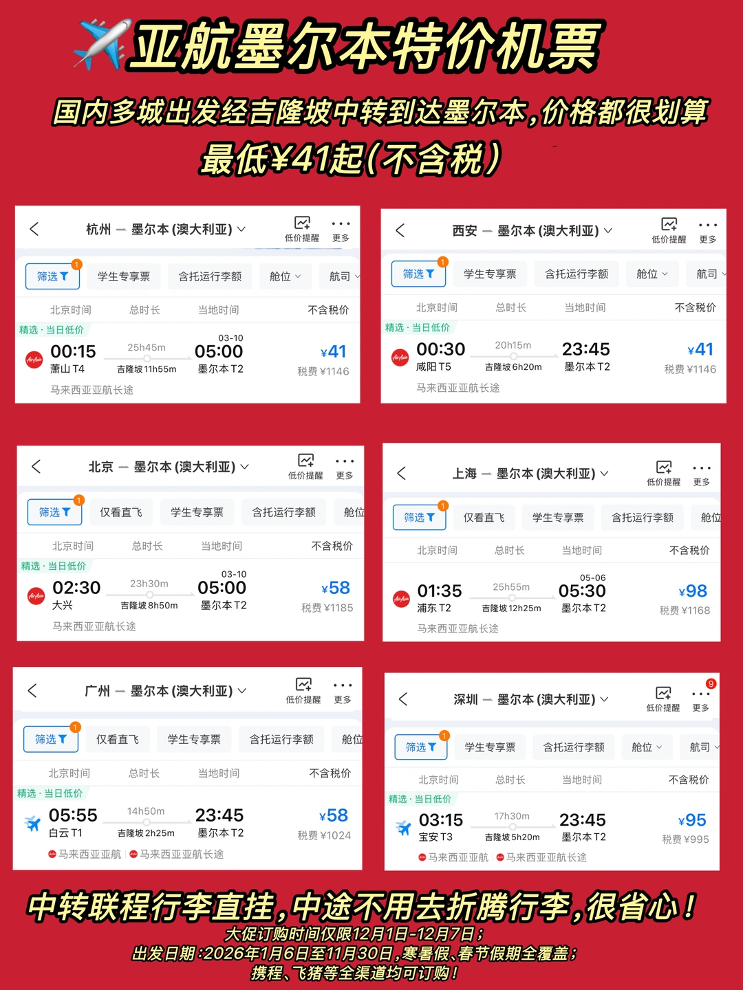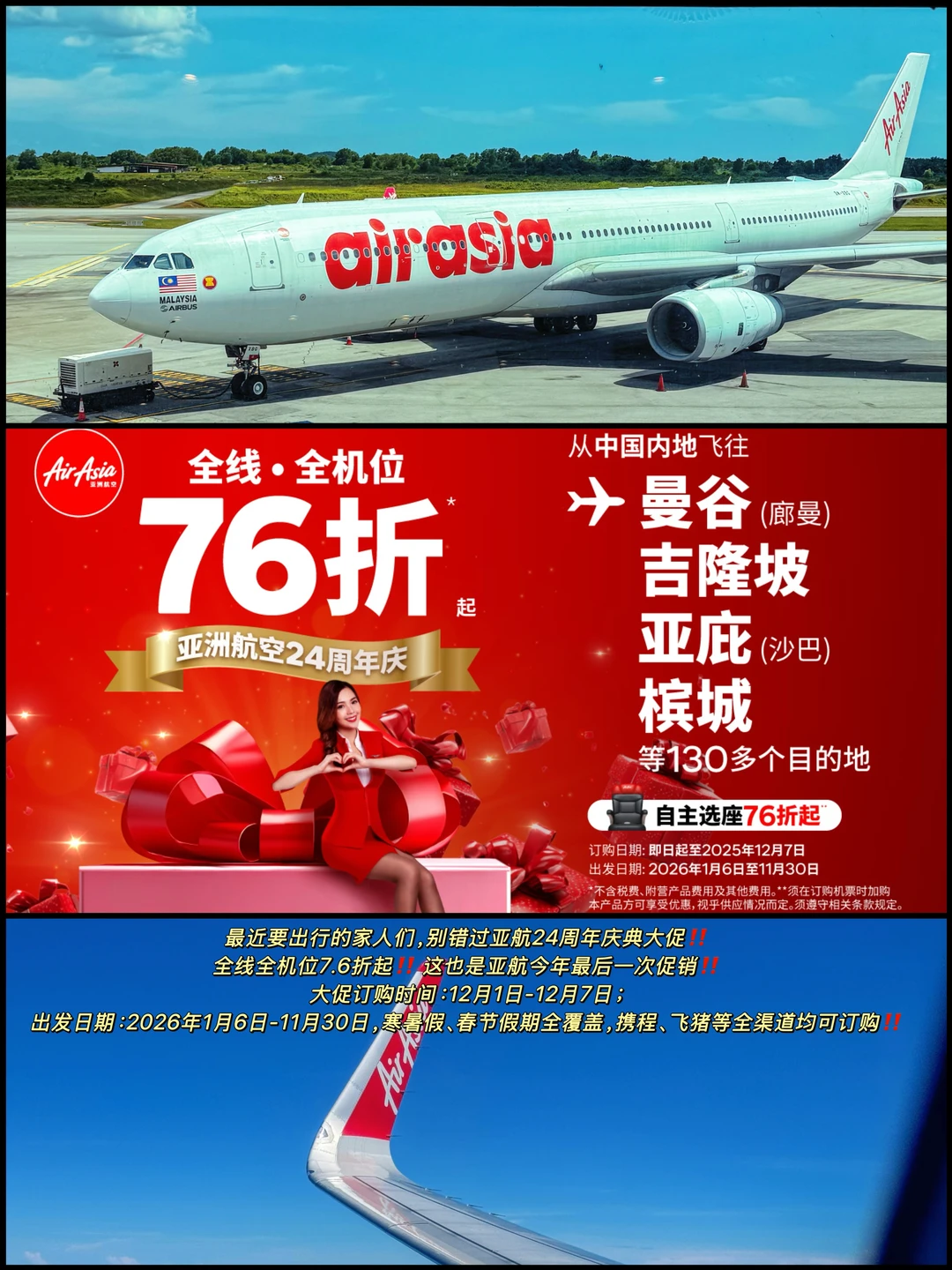 🌟现在亚航24周年促销,12.1-12.7预订,全线7.6折!出发日期覆盖2026年1月6日至11月30日,寒暑假、春节假期全覆盖,xie🍊、飞🐷等全渠道均可订购!