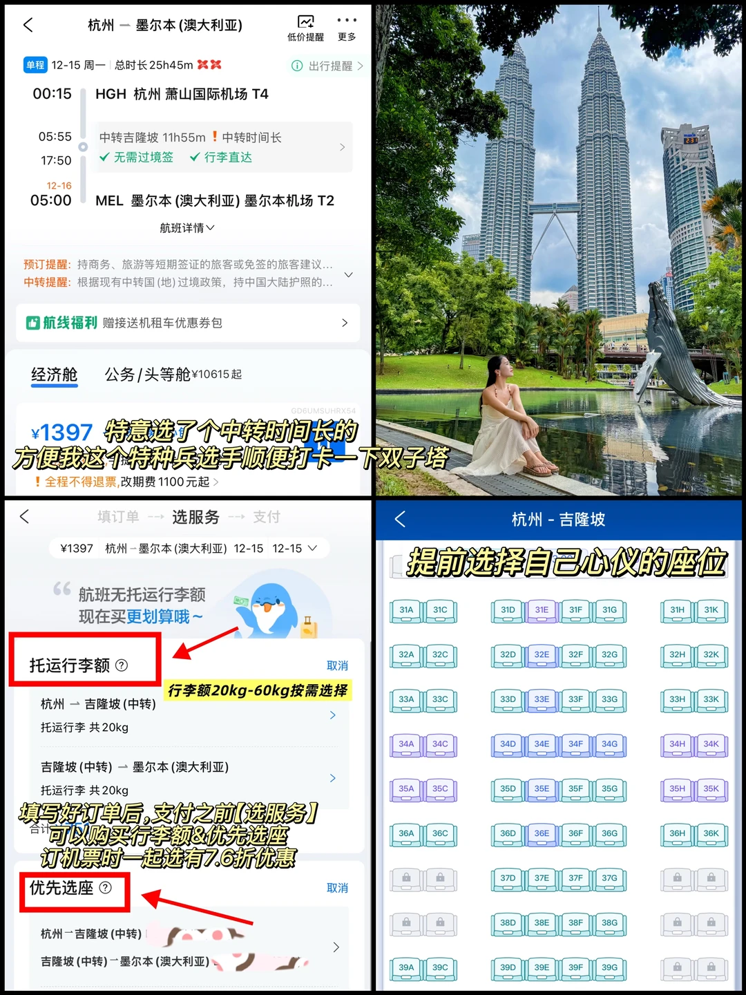 ✈️交通:我选择的航班是亚航从杭州出发,经吉隆坡中转抵达墨尔本,杭州出发票价264元起(不含税)感谢亚航帮我把旅行成本降到最低🙏且中转联程行李直挂,不用中途折腾行李超省心我还顺便打卡了双子塔🧚♀