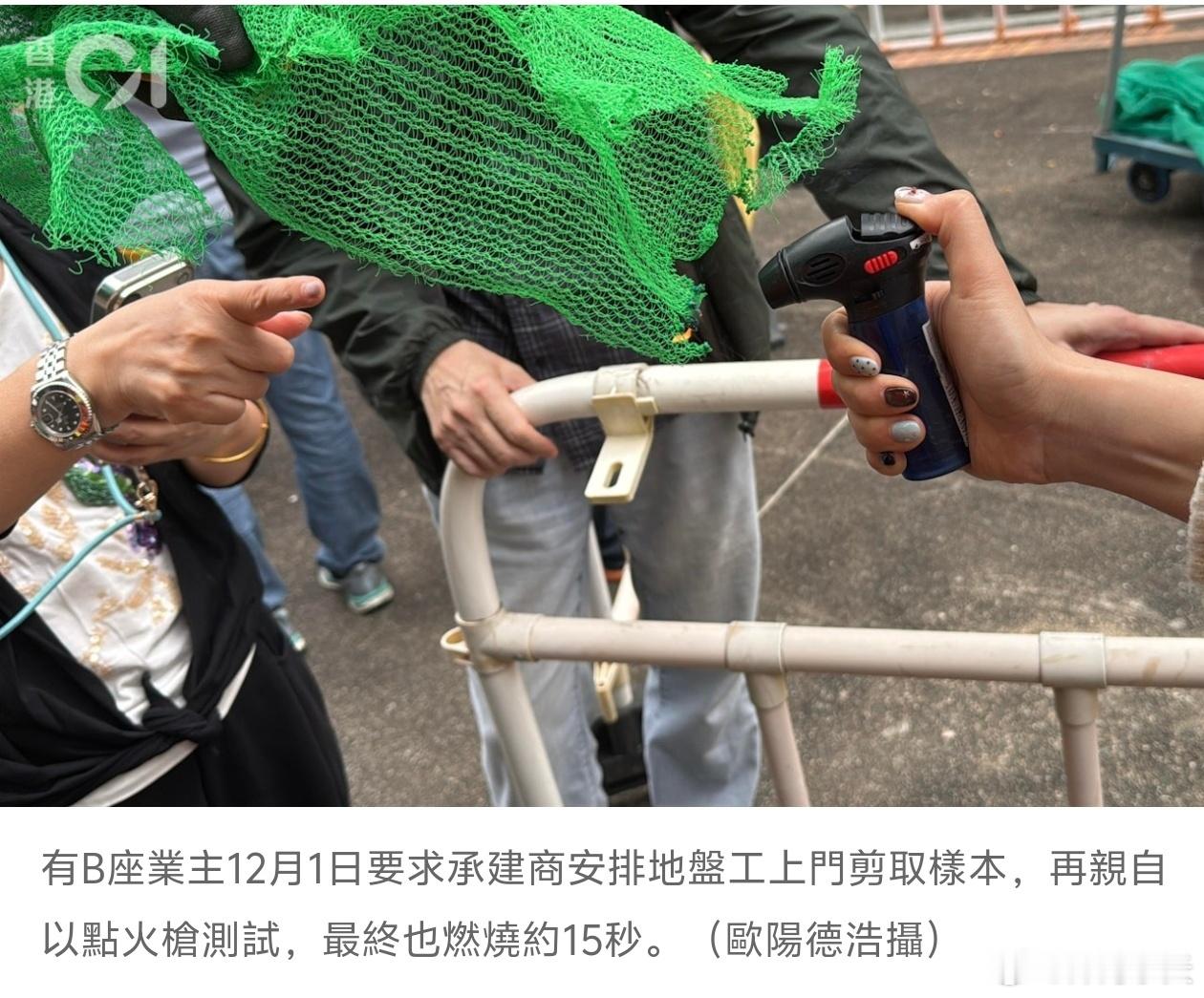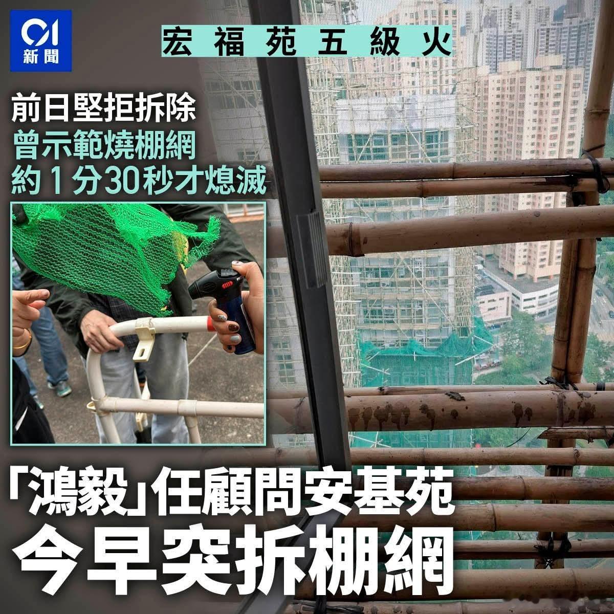 棚网符合英国标准,现场测试后全面拆除香港牛头角安基苑大厦维修,承建商负责人廖先生强调,棚网符合英国标准,称站在承建商的立场,只跟从屋宇署的指引,因此不会拆卸棚网。他更指,法团若要求中止工程,伟利建筑则会提出控告,以追讨相关损失。廖先生透露,大埔宏福苑发生火灾后,房屋署独立审查组分别在上周四及上周六(27日及29日),到场剪下棚网带回实验室化验,但为了释除业主的疑虑,他当时预告周一中午将即场示范烧棚网。《香港01》周一到场直击,只见地盘工使用点火枪逐一燃点棚网,另一人则手持灭火筒在旁戒备。测试结果发现,部份棚网持续燃烧数秒至10多秒,只有A座的棚网没有起火,其中安基苑C座21楼的棚网最严重,起火后维持约1分30秒才熄灭,有业主高呼︰「烧着好久啦!什么都烧光啦!」今日,有多名住户今早(2日)反映,承建商今早已开始拆除棚网。香港向火灾死难者家属发放慰问金中方回应英首相发表涉港言论