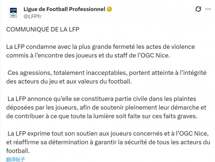 法国职业足球联盟向相关球员和尼斯足球俱乐部表达全力支持,并重申其保障足球界所有人员安全的决心。