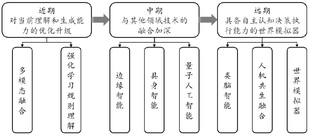 中期发展集中在与其他领域技术的融合加深,主要体现在边缘智能、具身智能和量子人工智能等方面,是对大模型与物理社会系统交互方式的重要拓展。边缘智能,大模型将广泛开源,中小型或个体开发者可以调用大模型能力提升边侧与端侧的开发应用效率;具身智能,通过赋予机器人实时反应能力和智慧赋能物理世界,实现更加紧密的人机交互;量子人工智能,利用量子计算机的特殊性质,如量子叠加和量子纠缠,来加速机器学习和优化算法,实现更高效、更准确的人工智能应用。