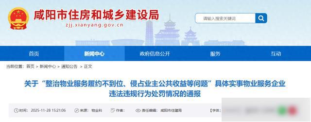 近日,咸阳市住房和城乡建设局发布《关于“整治物业服务履约不到位、侵占业主公共收益等问题”具体实事物业服务企业违法违规行为处罚情况的通报》,详情如下: