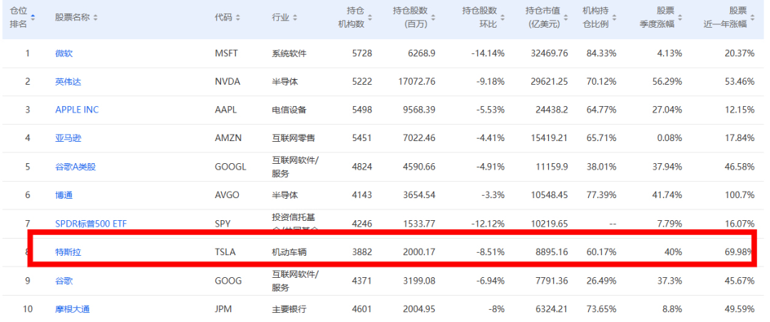 从此前披露的美国13F文件来看,截至今年三季度末,共有3882家机构持有特斯拉,持股数量为20亿股,相较于上季度末环比降低8.51%。具体来看,贝莱德、美国银行、法国巴黎资产管理公司都对特斯拉进行了不同程度减仓。