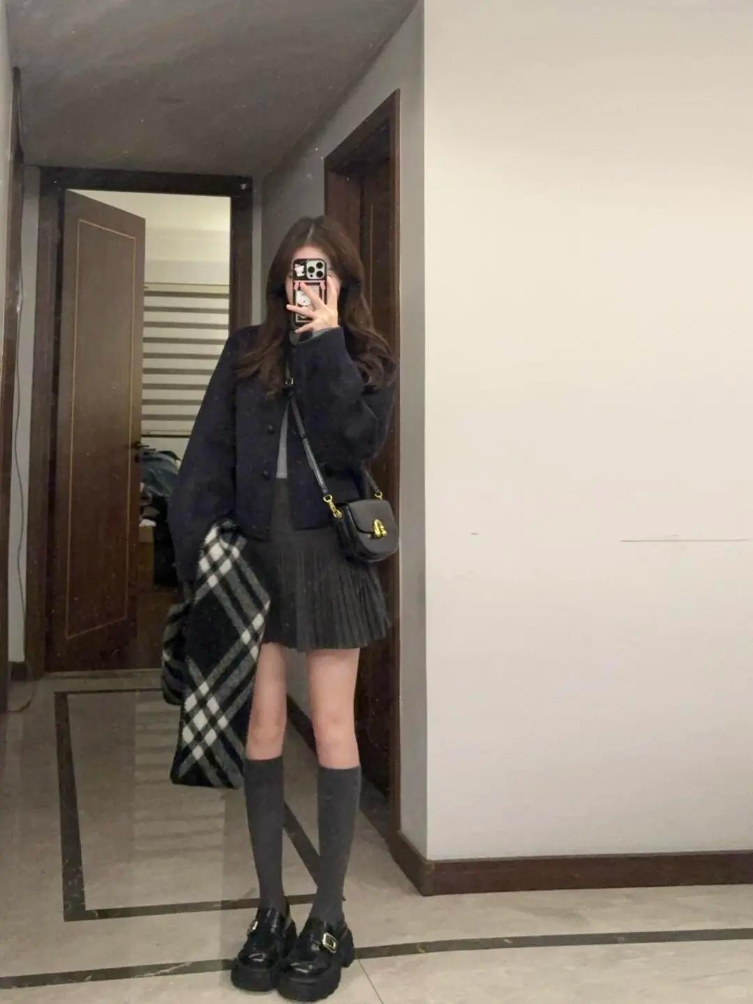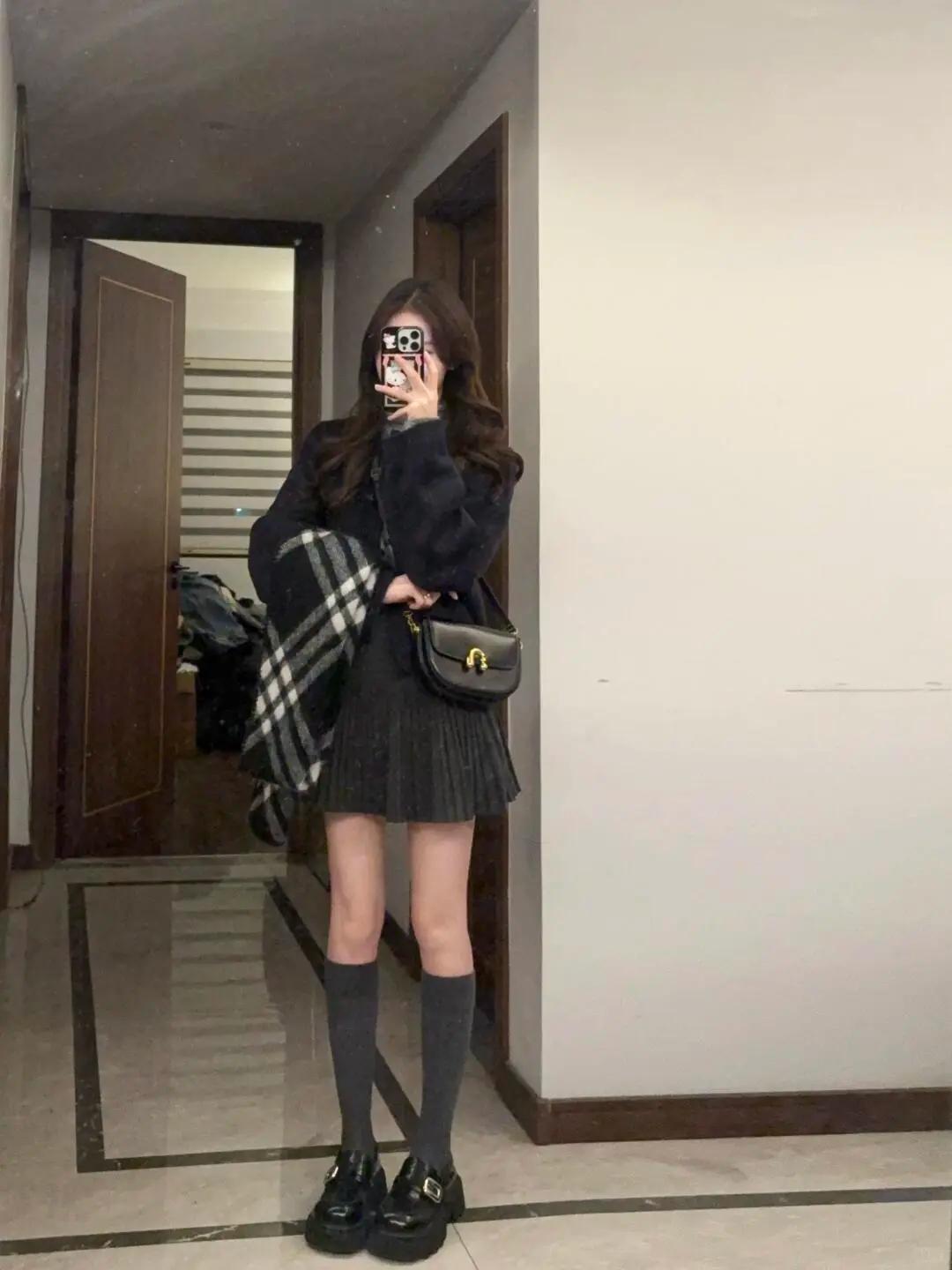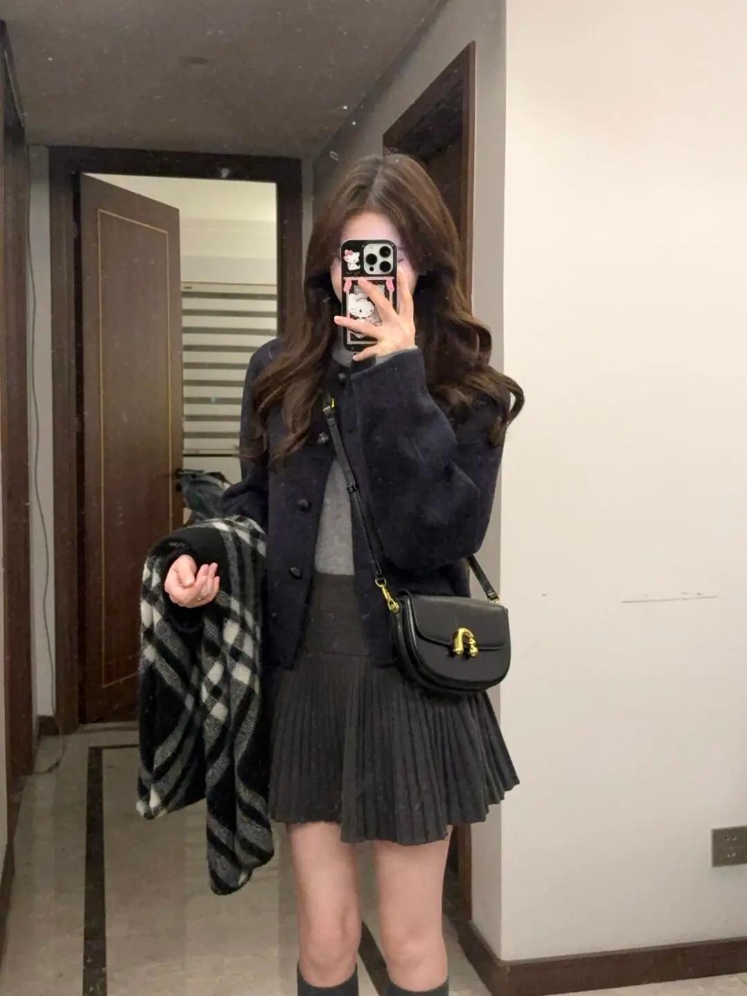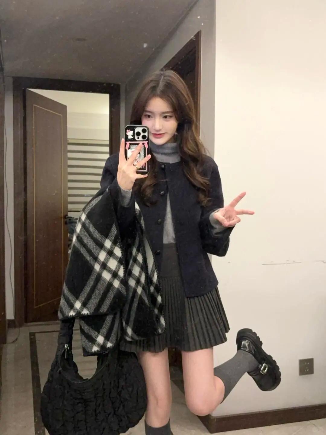 今天的穿搭是“黑灰系慵懒感”~短款外套配百褶裙,裹上格纹围巾刚好接住降温的风,踩双厚底鞋偷偷增高,手机壳的Hello Kitty是甜酷小心机~
