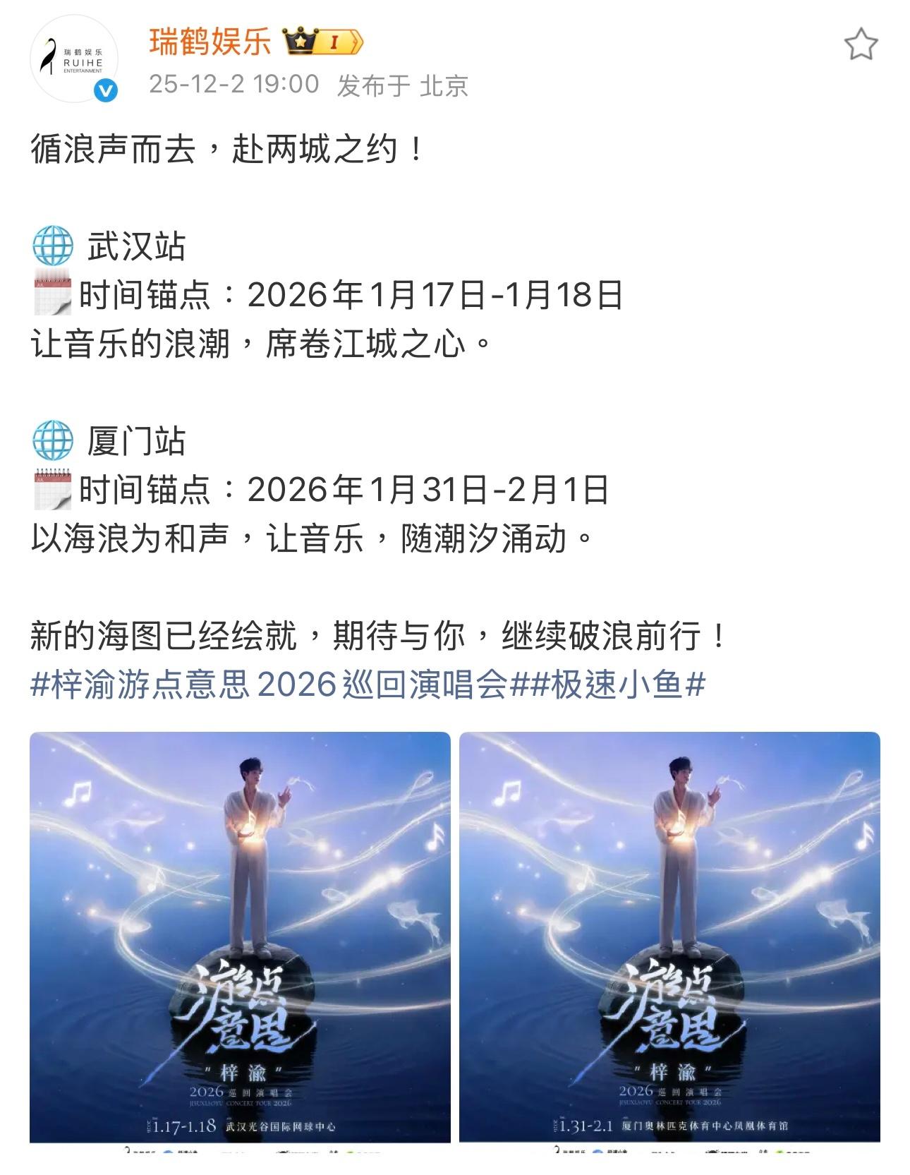 梓渝演唱会武汉站厦门站官宣,加上刚刚官宣的南京站,梓渝演唱会三城官宣,武汉站2026年1月17日-1月18日、厦门站2026年1月31日-2月1日、南京站2025年12月19日-2025年12月20日,三座城市以音乐共振,连唱两天,期待梓渝的现场