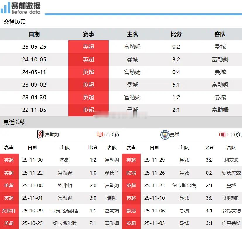 富勒姆vs曼城前瞻:一周双赛 农场主难阻曼城取分 福登状态拉满12月3日凌晨03:30,英超第14轮(一周双赛),富勒姆主场迎战曼城。比赛核心看点:两队近况:英超13轮后,富勒姆积17分排第15,曼城积25分位列第2。富勒姆近4轮3胜(上轮2-1胜热刺),曼城绝杀利兹联止两连败(福登闪击+绝杀)。一周双赛拼阵容:一周双赛背景下,曼城阵容厚度优势凸显。富勒姆状态虽佳,但曼城渴望客场击败对手拿3分,紧追阿森纳。福登近期脚感火热,哈兰德也盼进球。交手战绩:富勒姆近6次对曼城六连败。伤停情况:富勒姆罗伯逊、穆尼斯缺阵;曼城罗德里、科瓦西奇伤停。