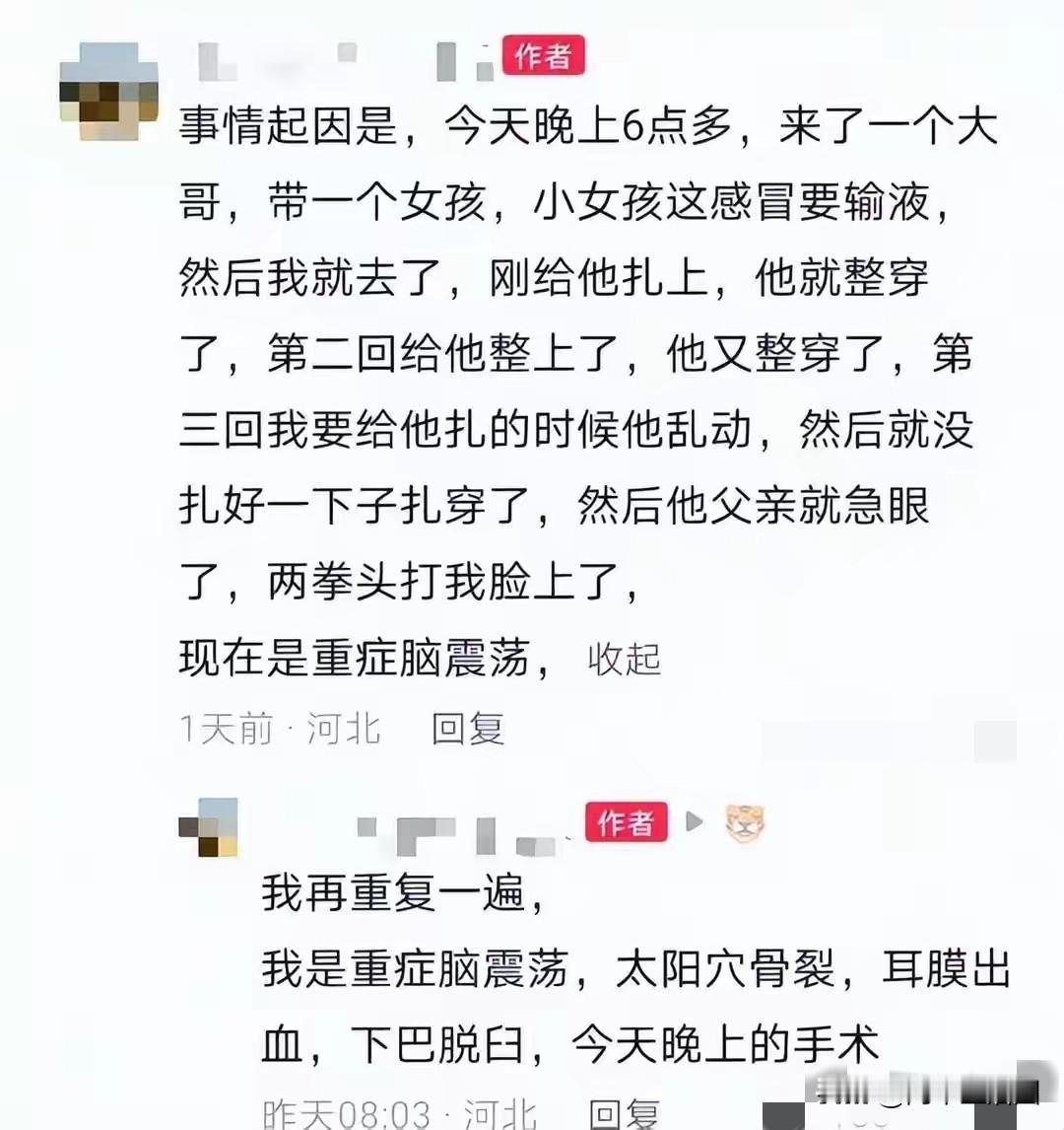 女护士因为给6岁女孩扎针被女孩父亲打出脑震荡,这事发生在河北秦皇岛。 这个23岁的小姑娘是一名护士,刚生完孩子一个多月,奶都没断呢,就赶回医院上班。为啥?还不是流感季人手不够,她心疼同事扛不住。 前两天晚上6点多,一个家长带着6岁的女儿来输液。孩子乱动家长也不管,跑针了三次,这位父亲二话不说,照着人家护士的脸就是两拳。 女护士当时就懵了,一检查才发现脑震荡、太阳穴骨裂、耳膜出血、下巴脱臼。 我就想问问,你家孩子金贵,人家护士的命就不是命?人家也是当妈的人,家里还躺着个一个多月的娃等着吃奶呢! 有人说理解家长心疼孩子。我不理解。心疼孩子你倒是看住啊,护士提醒了多少遍别乱动,你不听,针跑了怪谁? 扎针这活儿,老护士都不敢保证百发百中,更别说孩子血管细、还不配合。你以为护士愿意扎好几针,人家比你还急! 说白了,就是有些人骨子里瞧不起服务行业,觉得花了钱就是大爷,稍有不顺心就想用拳头说话。这种人活该进去蹲着。 好在结局还算解气,打人的进去了,四个月。但我觉得还是轻了。 医院不是擂台,白衣天使不是你的出气筒。连救你孩子的人都敢打,你配当爹吗? 希望这姑娘早点康复,该赔的钱一分别少要。至于那位大哥,好好在里面反省反省,什么叫"人在做天在看"。