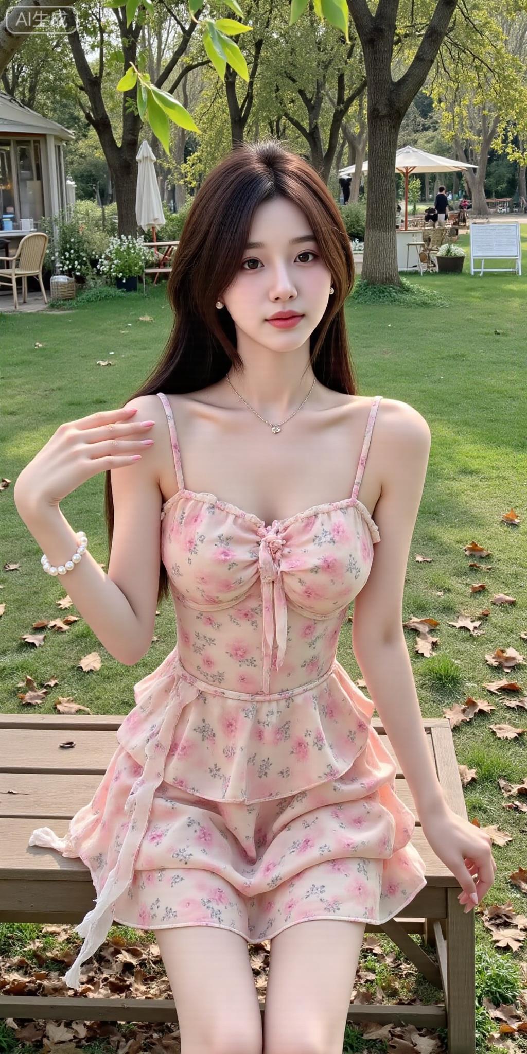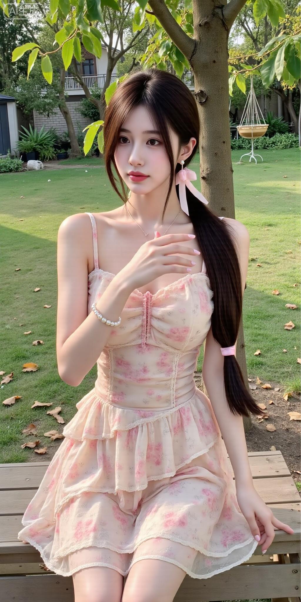 温柔甜美的少女,粉色吊带裙,自然光下更显清新动人。
