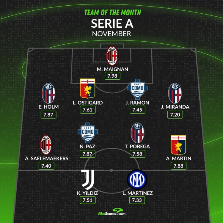 直播吧12月2日讯WhoScored根据球员的评分排出了意甲11月最佳阵容,伊尔迪兹、劳塔罗、帕斯在列。