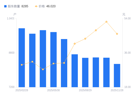 近一年(2024年11月30日至2025年11月28日),普蕊斯A股股东户数从9989户,减低至8285户,降幅17.06%,区间股价上涨47.77%。