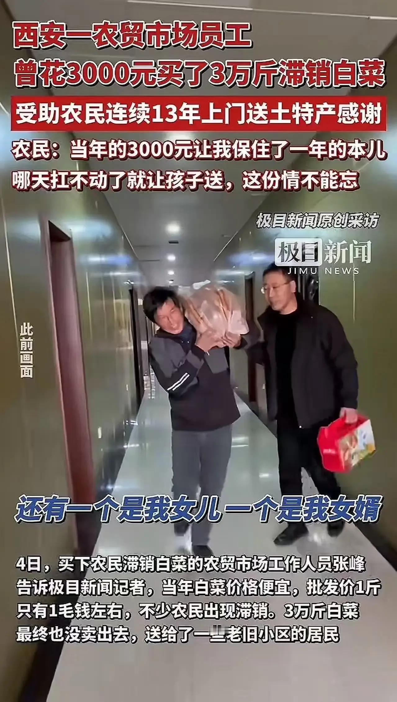 “这就叫知恩图报!”一个农民连续 13 年给农贸市场的工作人员送土特产,不是被逼迫,也不是走关系,而是感谢恩情!原来,这位市场员工曾花 3000 元下农民 3 万斤的滞销白菜,让农民保住了一年的本!农民说:“我要坚持送,哪天扛不动了,就让孩子送,这份情不能忘!” 这份情,不仅仅是一份简单的礼物,更是一种深深的感恩与回馈。在这个快节奏、功利至上的社会,或许我们更需要这样的故事,来提醒自己:善意与感恩,才是最打动人心的力量。 这位农民的坚持,让人忍不住反思:在现代社会,人与人之间的关系到底变得多么疏离?我们习惯了快餐式的交往,习惯了利益至上的合作,却少了那份发自内心的感恩。农民连续13年送土特产,或许只是个普通的行为,但它背后折射出的,是一种最朴实的情感——感恩与回馈。 你是否也曾在生活中遇到过那些默默帮助你的人?也许是一位善意的邻居,一位耐心的老师,或者是一位在关键时刻伸出援手的陌生人。我们都在用自己的方式,书写着属于这个时代的“知恩图报”。但令人感动的是,这位农民没有等到“恩人”主动要回报,而是用行动告诉我们:感恩,是一种责任,也是一份温暖的传递。 这故事还让我们看到:善良和真诚,才是人性最纯粹的光。市场工作人员没有因为金钱而忘记那份曾经的善意,也没有被利益冲昏头脑,而是用一份真心,温暖了整个冬天。这份恩情,像一股暖流,穿越了时间的长河,激励着我们每一个人去思考:我们能为这个社会,贡献些什么?我们是否也应该像这位农民一样,用心去感恩,用行动去回馈。 或许,社会的温暖就是如此简单而纯粹:一份真诚的感谢,一份持续的善意。它们像一颗颗种子,在人们的心田生根发芽,最终汇聚成一片温暖的海洋。你我都可以是那一份温暖的传递者,只要我们愿意,用心去感受,用行动去表达。 这故事告诉我们:无论身处何方,善良和感恩永远不会过时。它们是人性最美的底色,也是社会最坚实的基石。让我们都学会感恩,学会用行动去回馈那些曾经帮助过我们的人,也让这份善意,成为我们共同的力量,照亮未来的路。恩知图报 父母恩情图报