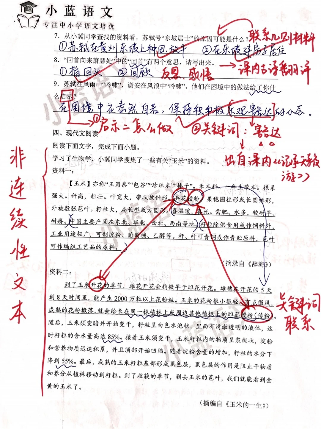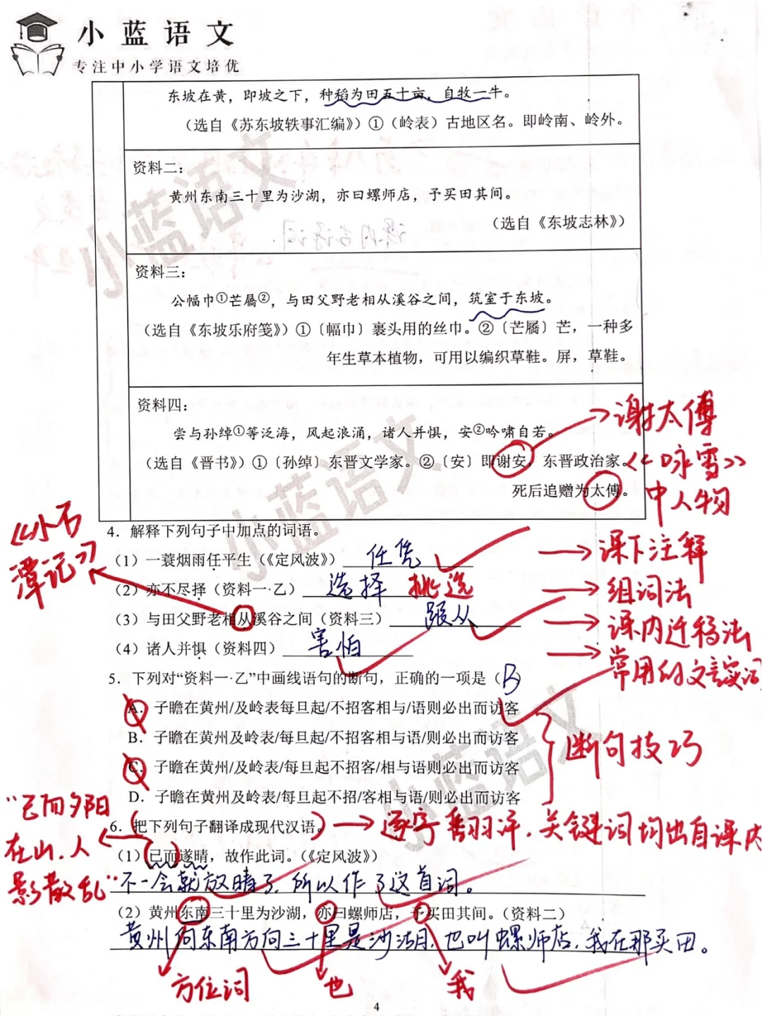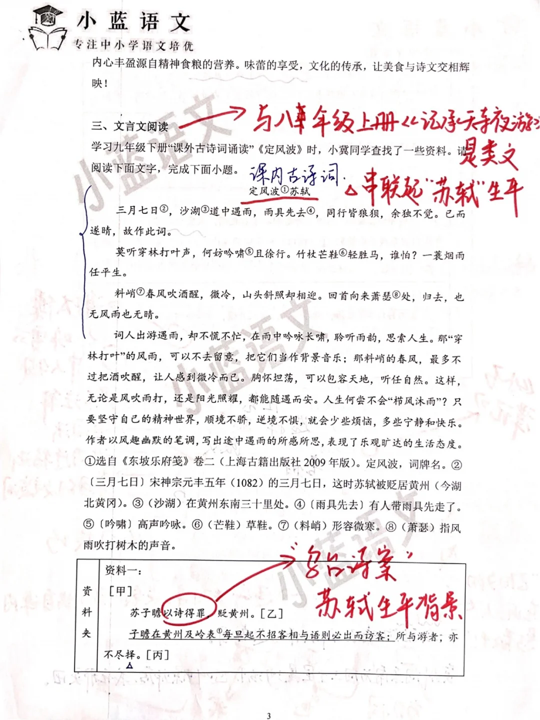 5、文言文阅读考察的是课内《定风波》及苏轼相关的文言文材料,如果对苏轼的生平有所了解,能够极大帮助我们做题,因此考前要对常考的古诗文作者简介要提前了解。