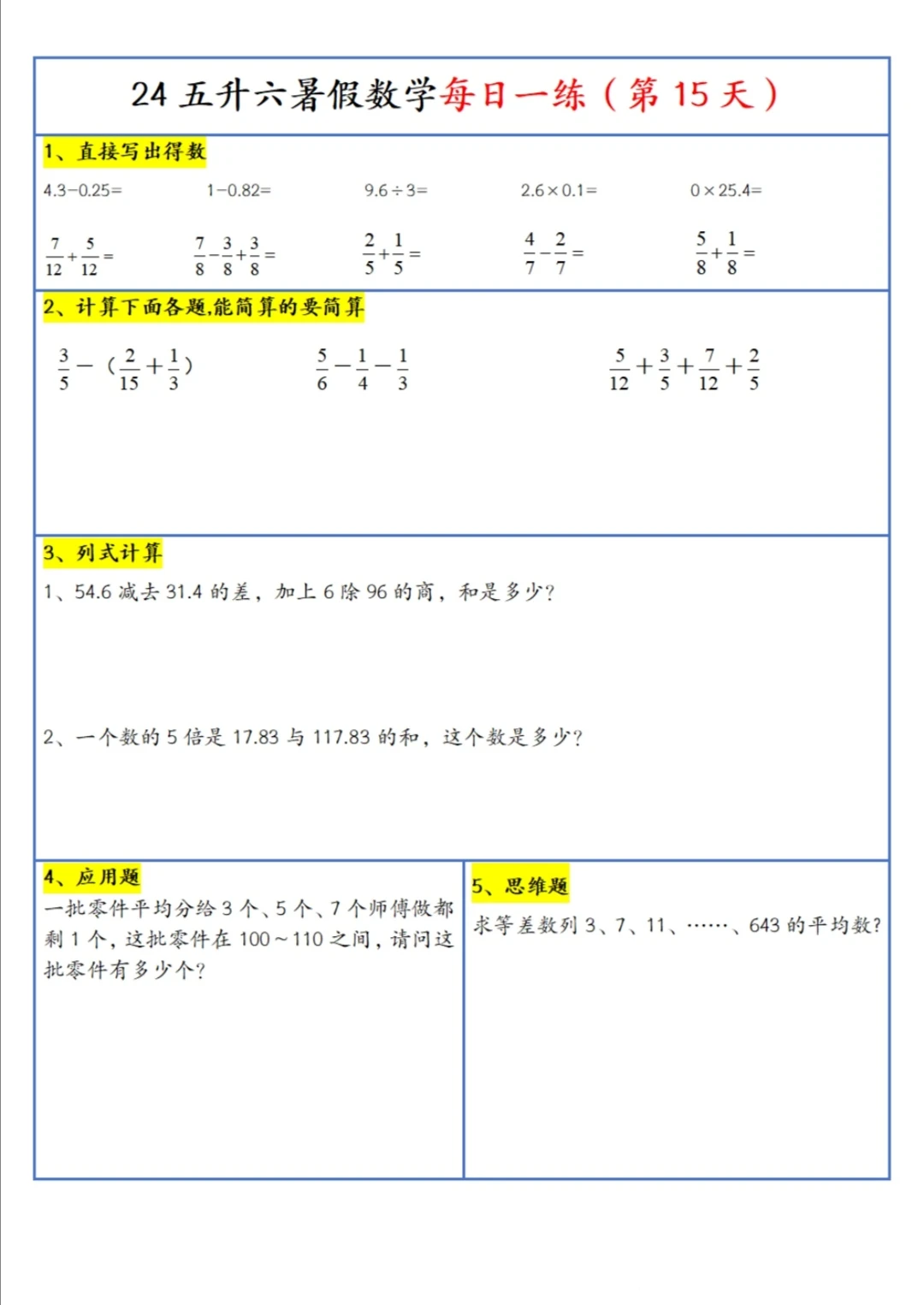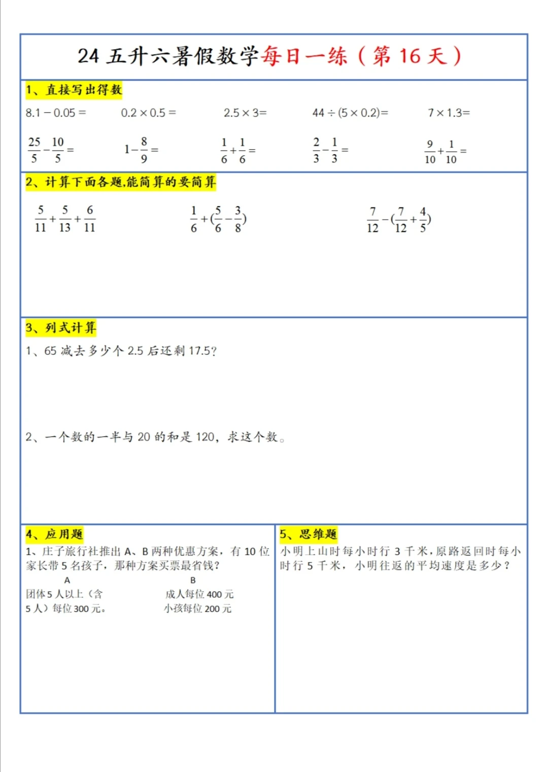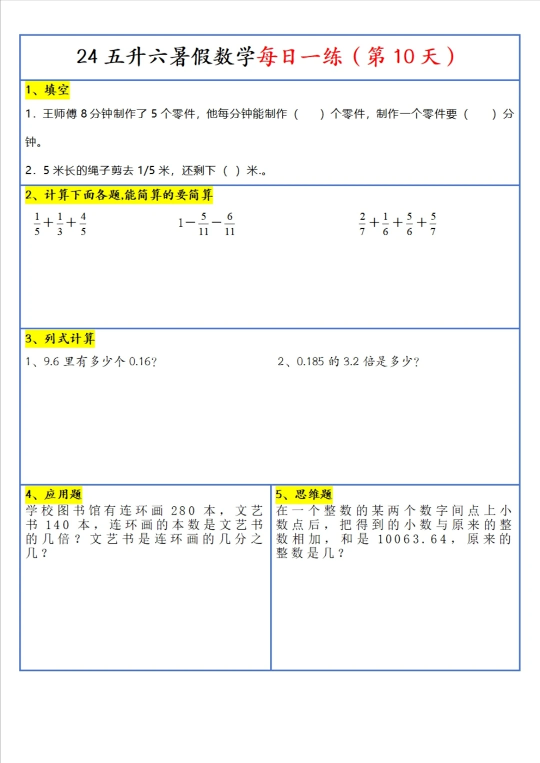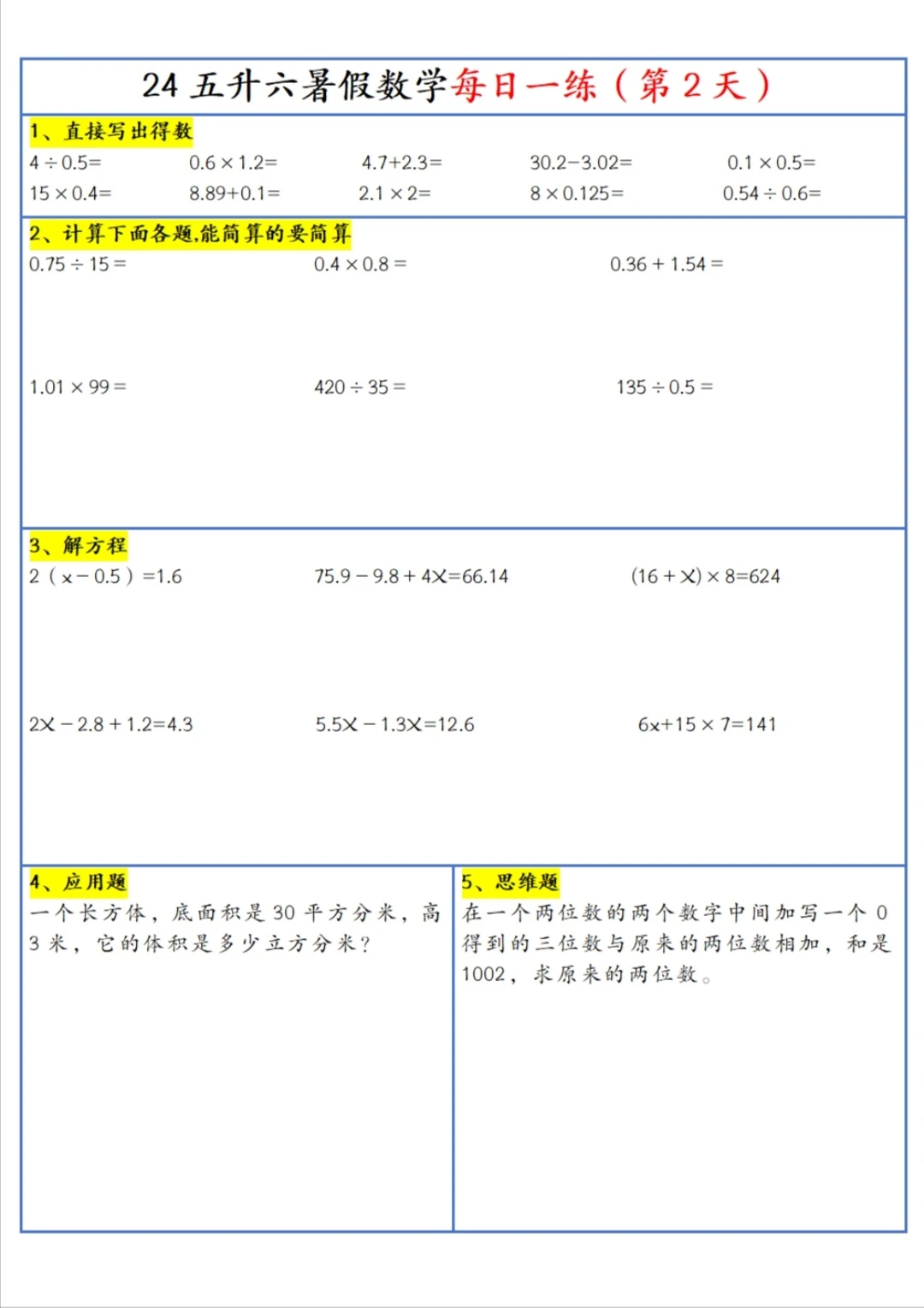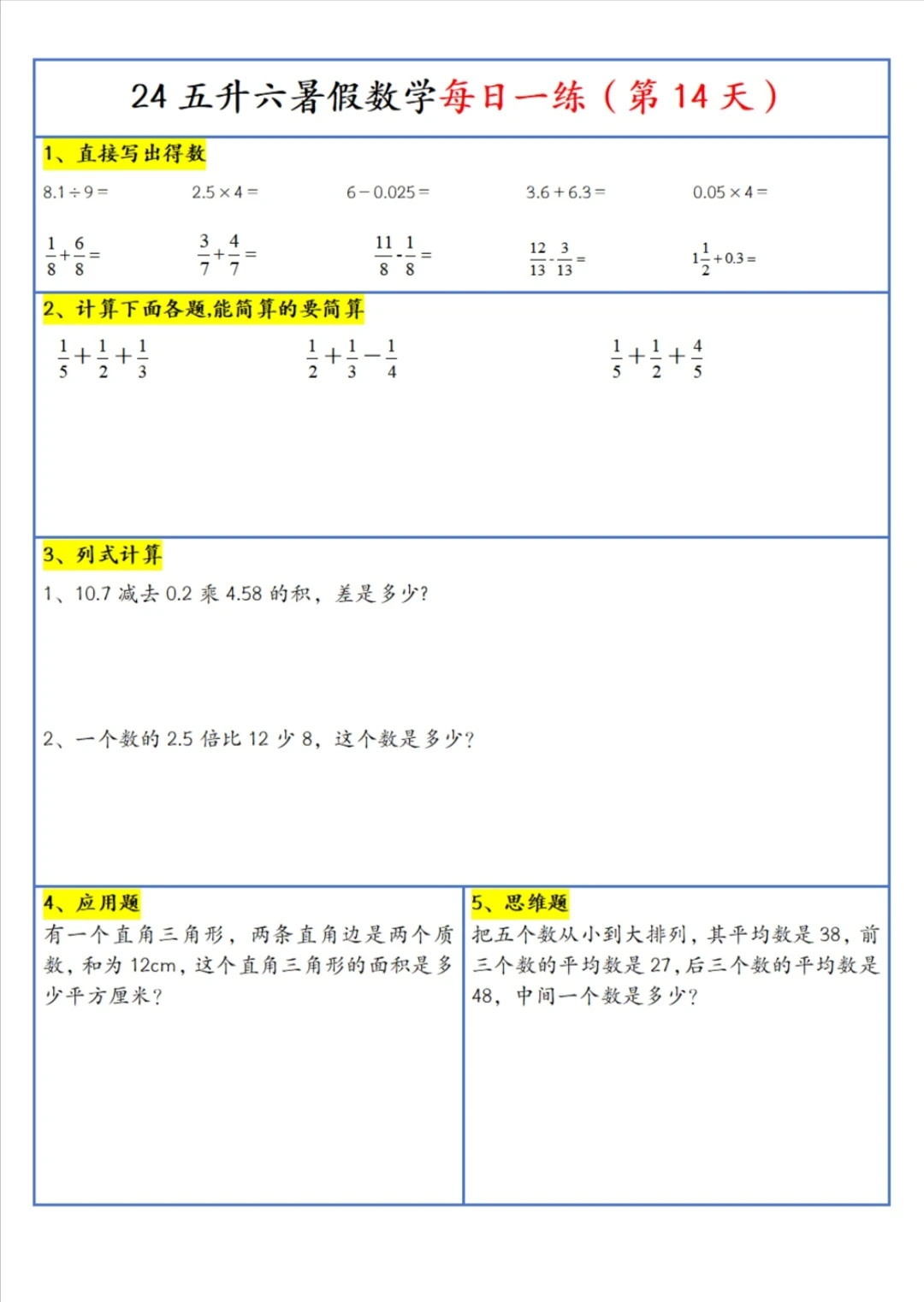五升六 暑假 每日一练(上)