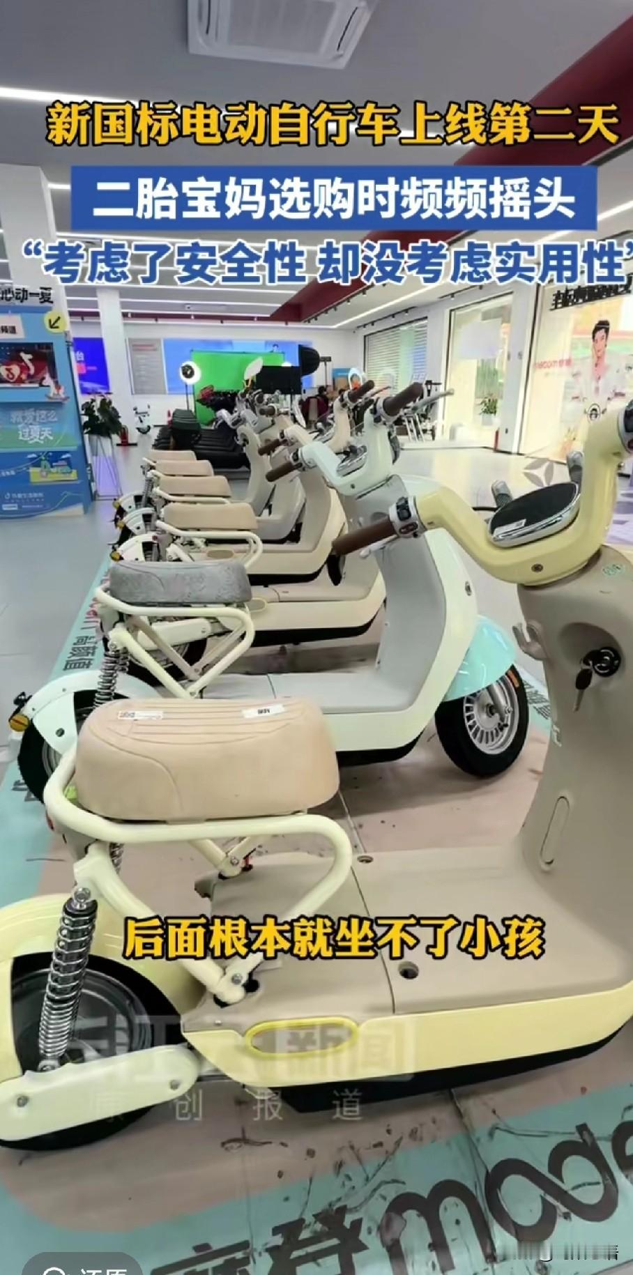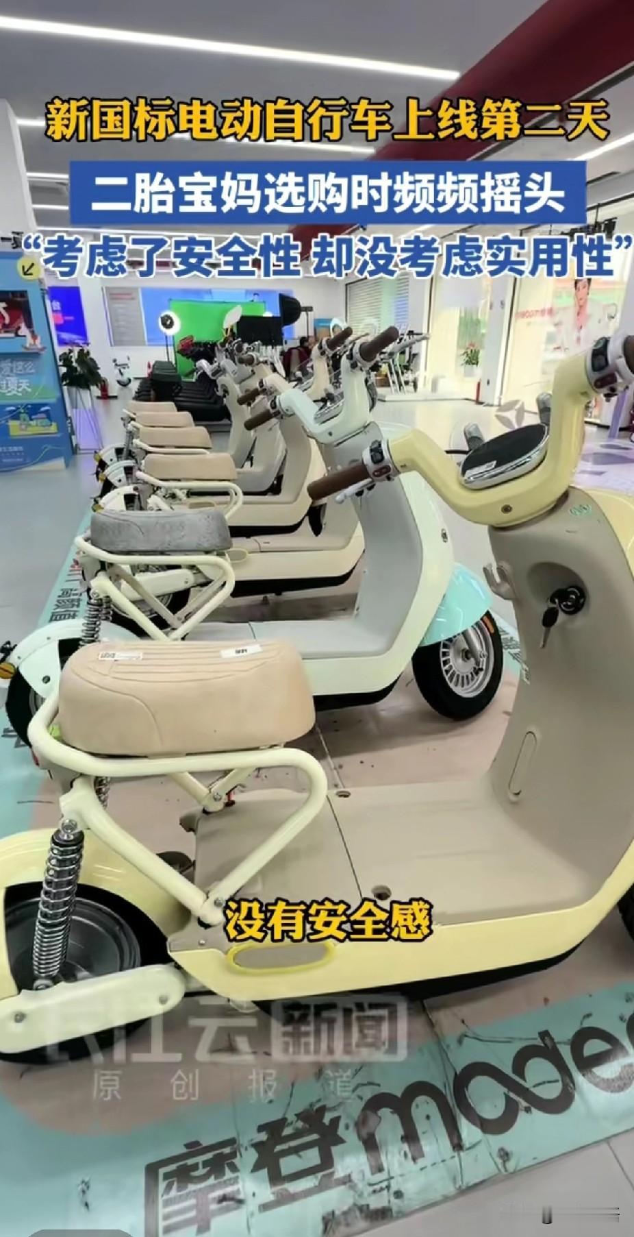 二胎宝妈选新国标电动车,当场崩溃摇头!直呼:“这车安全是安全了,可让我咋用?!”看网友评论: 新国标电动车,完美地避开了老版电动车的所有优点,普通老百姓根本欣赏不来! 大家看看这新国标车 ,取消了后座!这要是接俩娃可太难了!一个娃只能挤前面踏板上,颠簸不稳,还怕被交警抓!以前的老车虽然丑点,但能装能坐啊! 新车不光不能带人,连放东西的地方都没了!连个菜篮子都挂不上,设计师咋想的?我们普通老百姓,上街买个菜啥的 都没地方挂! 碰上天气不好,想带个雨衣防着,出门了,充电电瓶也没地方放!这设计时咋想的呢? 店员说,新规要求用阻燃材料,塑料少了,只能做成镂空的,储物就别想了。 速度也让人急死!最高就25公里,路上想加点速避让快递车?搞不好突然断电,“像抽了筋似的往后滑”,桥上要是来这么一下,后车追尾魂都吓飞!爬坡更费劲,蹬得腿抽筋! 那金属座椅是酷,可冬天冻屁股像坐冰板凳,夏天烫得能直接煎蛋!价格还贵得离谱,最便宜的新车要2500,顶配快四千,比老车甩卖价贵出一千块! 虽然新车刹车好点、雨天稳点、着火烟小点还有定位,但好多顾客看看价格摸摸座椅,还是犹豫了:“这车,买得肉疼,用得更疼啊!” 网友质疑了:一群不骑电动车的人制定标准,配置减了,价格高了,生产电动车的乐了,苦了骑电动车的;多用两块铁皮就安全防火了? 大家觉得是新车好,还是旧版车更适合你?欢迎评论区讨论!新电动车新规
