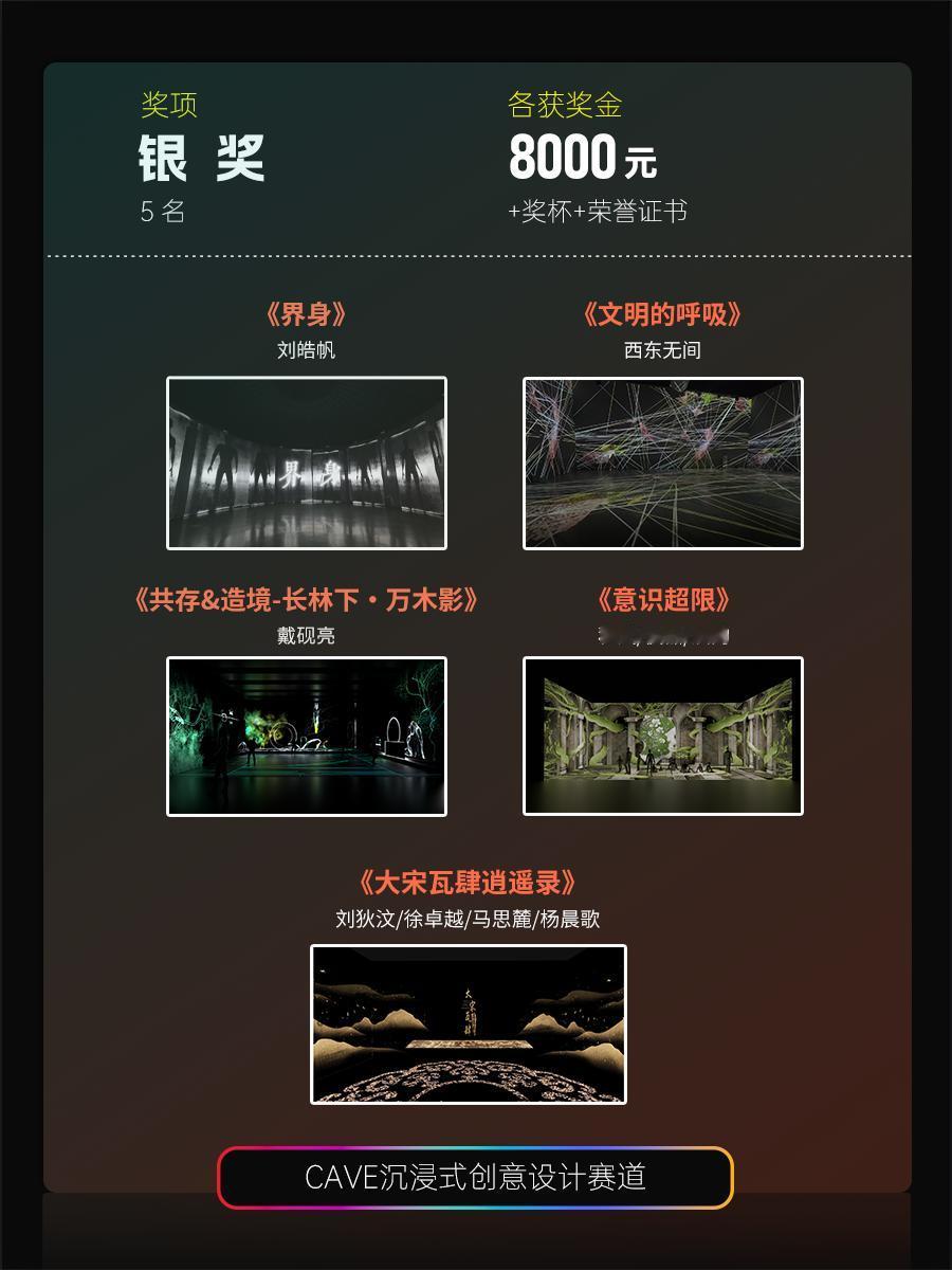 🔥我们第四届 “光年奖” 数字创意大赛圆满收官啦! 215 件全球投稿作品同台比拼[奋斗],最终 32 件佳作成功折桂~五大赛道全覆盖, 更有 CAVE 赛道奖金升级到 10 万诚意加码[得意]!23 位企业、院校等专家坐镇评审,专业度拉满! 悄悄说,获奖作品后续会在官方平台展示,数字创意碰撞跨界融合的精彩[给力],大家速蹲! 数字创意 光年奖 跨界融合
