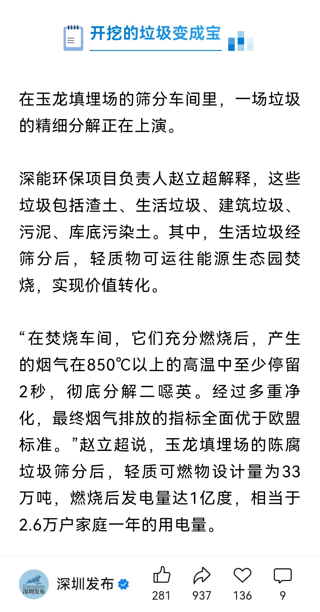 中国的垃圾看来真的不够烧了。深圳2024年启动把全国最大的垃圾山挖了,在罗湖区的银湖山脚下,高度竟然有110米高,总体积高达255.15万立方米。 深圳市中心挖出一座110米高的“垃圾山”,它叫玉龙坑,堆积垃圾总量达255.15万立方米。1983年启用,2005年封场,如今被住宅区和商场包围,成了城市的隐患。 2024年,深圳投资21.7亿元启动全面开挖治理,不只是清运填埋,而是要把垃圾变成可发电、可造建材的资源。这座垃圾山的问题积累了几十年。 厌氧发酵产生的甲烷易燃易爆,渗滤液渗入地下可能污染水源,堆体沉降还会引发塌陷,常年恶臭困扰周边居民。 城市扩张让这座填埋场从城郊变成市中心,风险更明显,所以被列为罗湖区“一号工程”。 那么,挖出来的垃圾去哪里?深圳选择了现代化焚烧。五大能源生态园配备机械炉排炉,每台每天处理850到1000吨垃圾,燃烧控制和烟气净化系统经过优化,就算是陈腐垃圾也能高效处理。 烟气经过多道工艺处理,氮氧化物、酸性气体、二噁英和粉尘都被严格控制,排放指标达到国际先进水平。焚烧后的垃圾还产生多种资源。 炉渣可加工成环保砖、人行道地砖,飞灰稳定化处理后安全填埋,渗滤液经过生化和膜分离回用,实现零排放。 垃圾体积可减量90%以上,发电量足以满足数十万户家庭全年用电,部分园区还能利用余热供蒸汽,实现能源循环。 深圳的做法体现了垃圾处理理念的转变。过去依赖填埋应对垃圾,现在是“源头减量+分类回收+焚烧发电+残渣资源化”全链条管控。 垃圾分类能回收可利用物,剩余垃圾送能源生态园焚烧,最终残渣也被二次利用,形成闭环管理。这种模式的意义不仅在环保,也在城市可持续发展上。 越来越多城市面临“存量垃圾围城”,深圳提供了可操作经验:通过科技手段将垃圾转化为能源和建材,同时修复生态,让原本的填埋场重新融入城市发展。玉龙坑治理展示了城市管理的智慧。 垃圾不是废物,只是放错了地方的资源。科学规划、先进技术和有效管理,可以让“城市伤疤”变成绿色资产。 城市环保、经济效益和社会效益可以同时实现,这种模式为大城市垃圾治理提供了可参考的示范。 你所在的城市垃圾是怎么处理的? 你支持这种“开挖治理+资源化利用”的方式吗? 信源:澎湃新闻客户端——垃圾“清仓”!深圳开挖全国体量最大填埋场
