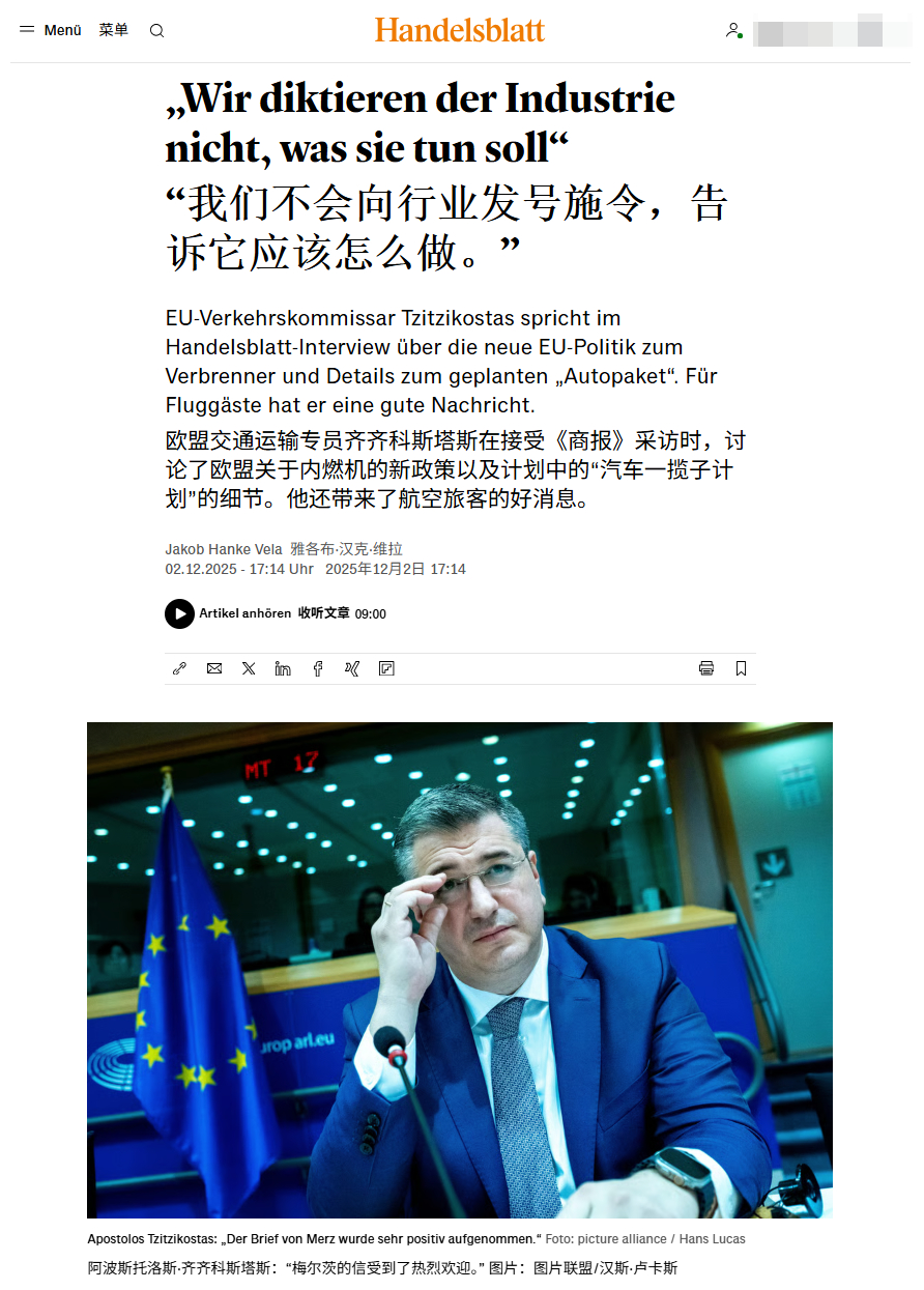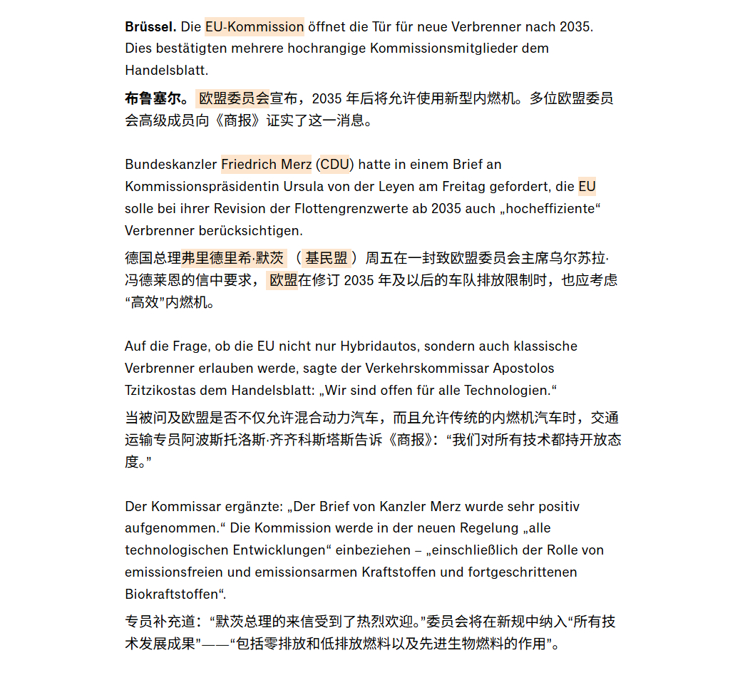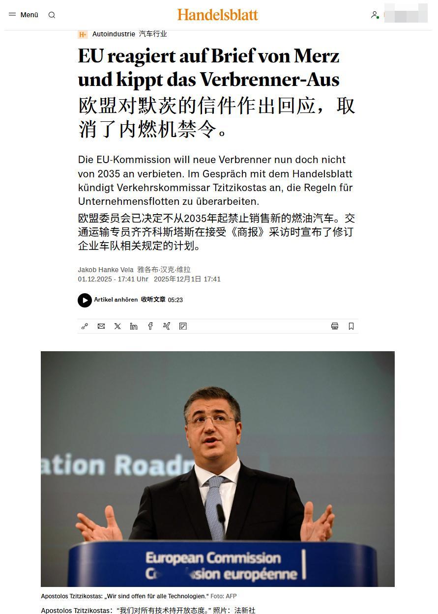 早在2023年2月我就预言过,若欧盟2035年禁燃决议不调整,将会导致欧盟解体。现在,调整将至:欧盟委员会打算取消2035年内燃机禁令。欧盟交通运输专员Apostolos Tzitzikostas 在昨天接受《商报》采访时表示, 欧盟在重新评估车队排放限制时,将会把所有技术进步的可能性都会考虑在内,包括使用电子燃料和生物燃料的内燃机,欧盟对所有技术都持开放态度。另两位欧盟委员会官员则证实,欧盟打算允许继续使用传统内燃机,只要这些发动机使用生物燃料或E-Fuel即可。欧盟希望坚持既定目标,但同时也必须将近期所有的地缘政治形势变化纳入考量。必须确保在不损害自身竞争力的前提下,协助欧洲产业维持其技术领先优势。因此,欧盟也正在探讨如何能最有效地强化欧洲的汽车价值链。事情的直接原因是德国总理Merz致信欧盟委员会主席冯德莱恩要求:欧盟在修订 2035 年及以后的车队排放限制时,也应考虑“高效率”内燃机。虽然欧盟并没有直接透露是否可以继续允许使用化石燃料的传统内燃机,但Merz的来信在欧盟内部反响热烈,并得到了积极的回应。总体来说,内燃机整体禁令取消可以说是板上钉钉了,唯一还存在摇摆的是只允许使用“零排放”燃料还是化石燃料也允许。欧盟在2023 年时做出的2035 年禁燃令会让所有内燃机新车都无法注册上路。然而近几年欧盟在来自工业界和成员国的压力下,其主席冯德莱恩宣布将2026年重新审视逐步淘汰内燃机的相关法规提前到今年,并在12月10日发布欧盟汽车业界一揽子计划。由于上面Merz的致信,此计划宣布被推迟到月底甚至1月初发布,其中不仅会放宽车队层面的CO₂ 排放限值,还会为企业车队使用电动汽车创造新的激励措施。放宽限值这对大众集团其实至关重要,2024年的时候,大众集团通过组建排放池,推迟燃油车注册和年底电动车大促销活动勉强通过了约为121g/km排放目标,虽然牺牲了一些盈利,但避免了大规模的罚款,但2025年,根据目前售卖车辆的种类,重量测算,针对大众集团的限值将骤降至约为105g/km。倘若没有任何改善,罚款将会接近40亿欧元。而2024年大众集团的营业利润Operating Profit约为 180亿欧元,而今年肯定会继续下降。在这情况下,40亿欧元对集团的影响举足轻重。最后附上商报机翻相关内容截图,大家自行分析。