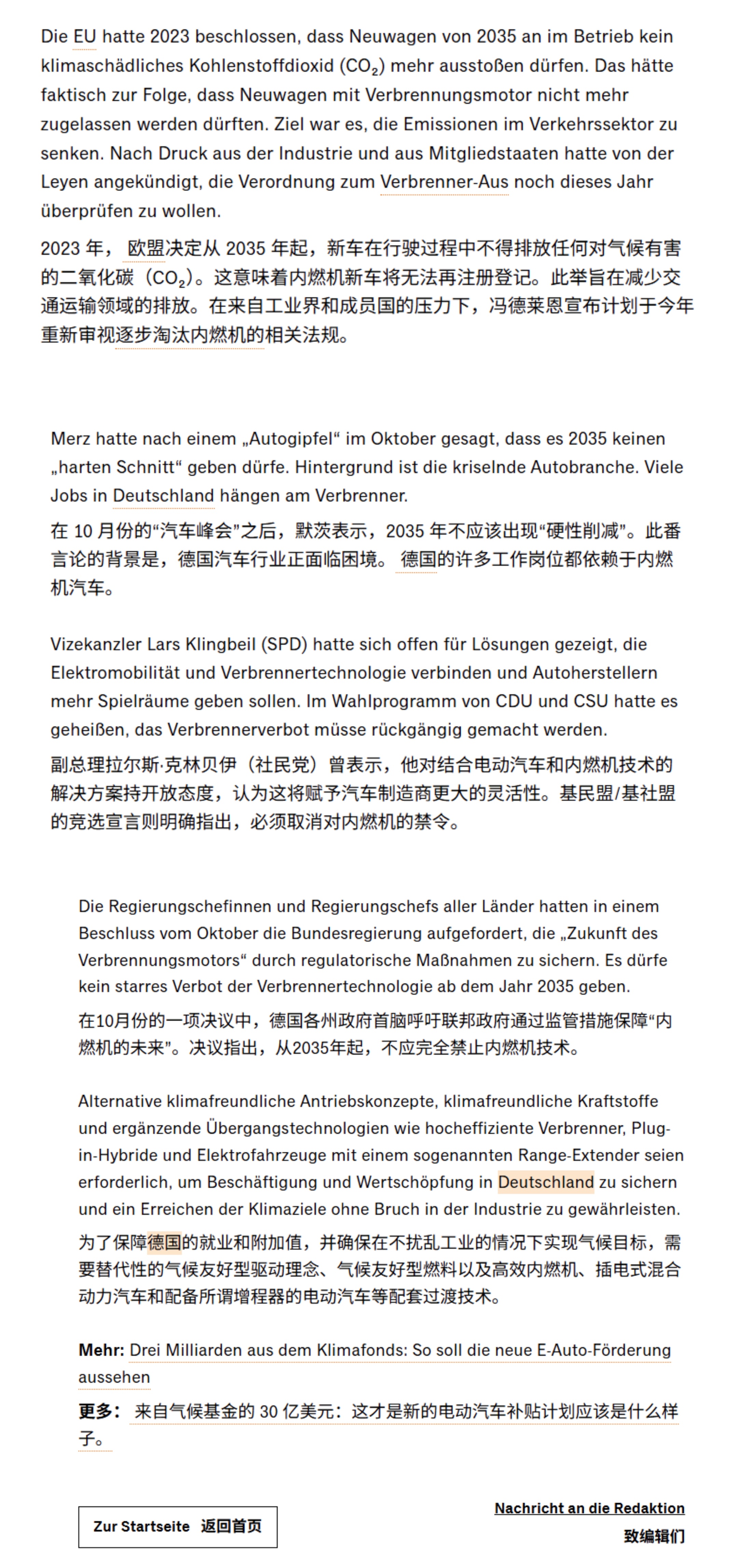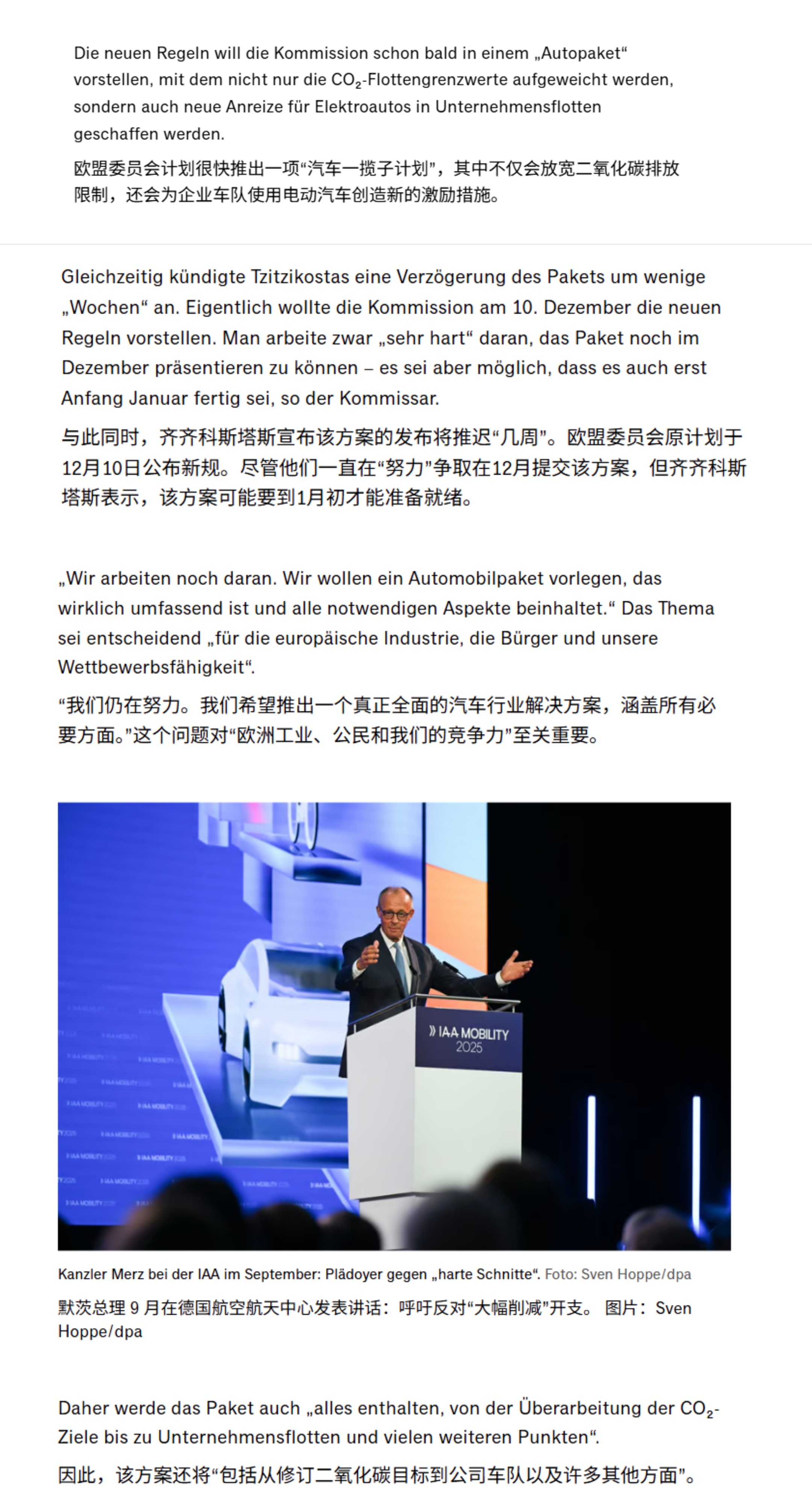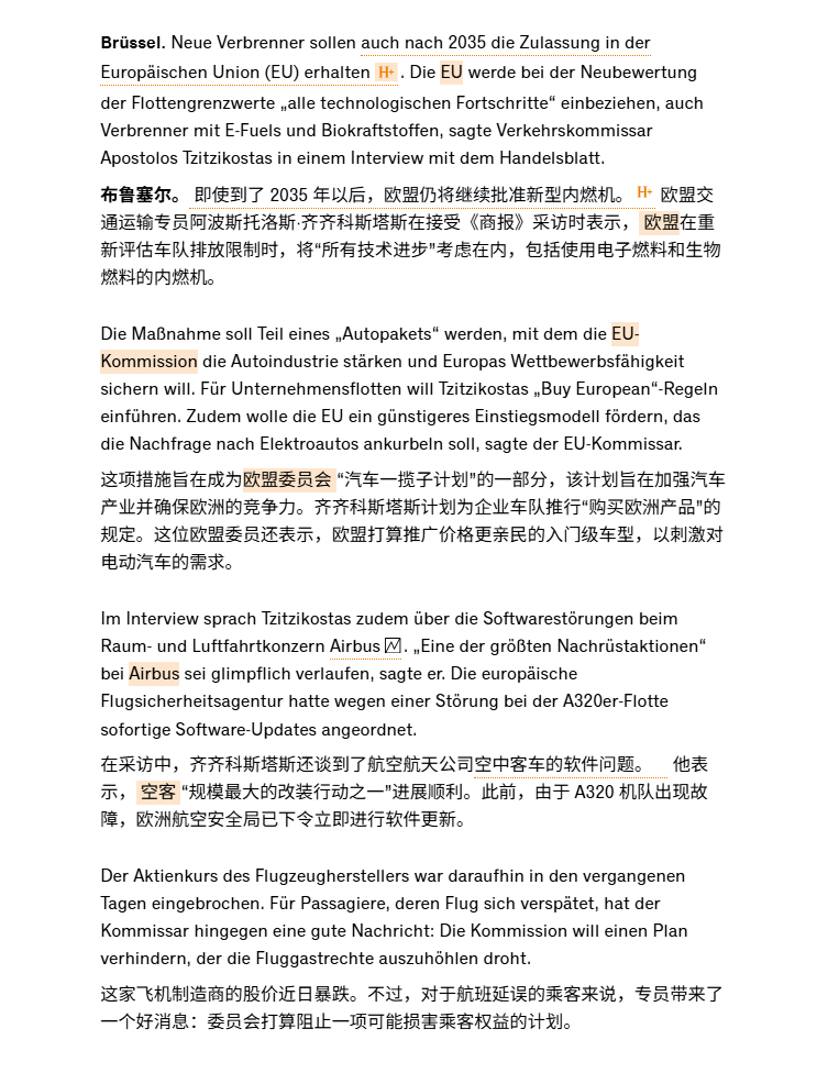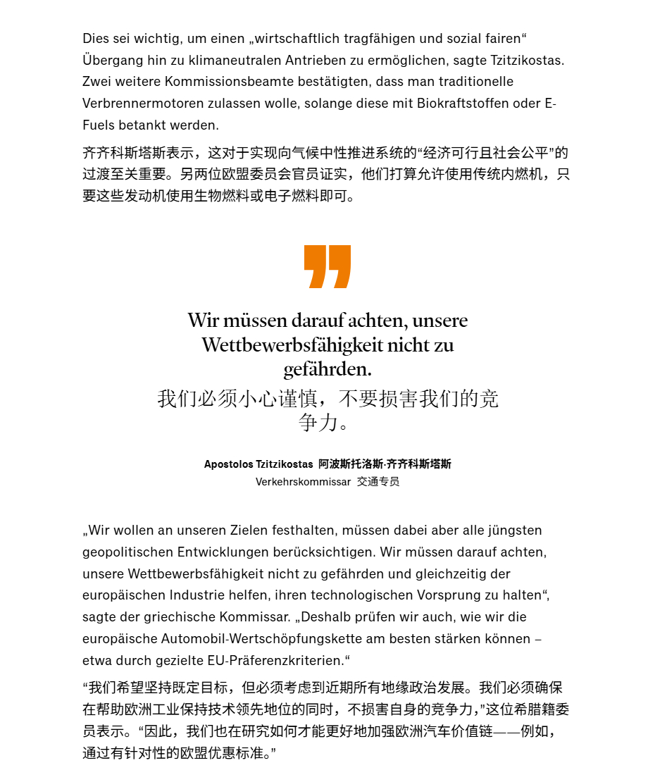 早在2023年2月我就预言过,若欧盟2035年禁燃决议不调整,将会导致欧盟解体。现在,调整将至:欧盟委员会打算取消2035年内燃机禁令。欧盟交通运输专员Apostolos Tzitzikostas 在昨天接受《商报》采访时表示, 欧盟在重新评估车队排放限制时,将会把所有技术进步的可能性都会考虑在内,包括使用电子燃料和生物燃料的内燃机,欧盟对所有技术都持开放态度。另两位欧盟委员会官员则证实,欧盟打算允许继续使用传统内燃机,只要这些发动机使用生物燃料或E-Fuel即可。欧盟希望坚持既定目标,但同时也必须将近期所有的地缘政治形势变化纳入考量。必须确保在不损害自身竞争力的前提下,协助欧洲产业维持其技术领先优势。因此,欧盟也正在探讨如何能最有效地强化欧洲的汽车价值链。事情的直接原因是德国总理Merz致信欧盟委员会主席冯德莱恩要求:欧盟在修订 2035 年及以后的车队排放限制时,也应考虑“高效率”内燃机。虽然欧盟并没有直接透露是否可以继续允许使用化石燃料的传统内燃机,但Merz的来信在欧盟内部反响热烈,并得到了积极的回应。总体来说,内燃机整体禁令取消可以说是板上钉钉了,唯一还存在摇摆的是只允许使用“零排放”燃料还是化石燃料也允许。欧盟在2023 年时做出的2035 年禁燃令会让所有内燃机新车都无法注册上路。然而近几年欧盟在来自工业界和成员国的压力下,其主席冯德莱恩宣布将2026年重新审视逐步淘汰内燃机的相关法规提前到今年,并在12月10日发布欧盟汽车业界一揽子计划。由于上面Merz的致信,此计划宣布被推迟到月底甚至1月初发布,其中不仅会放宽车队层面的CO₂ 排放限值,还会为企业车队使用电动汽车创造新的激励措施。放宽限值这对大众集团其实至关重要,2024年的时候,大众集团通过组建排放池,推迟燃油车注册和年底电动车大促销活动勉强通过了约为121g/km排放目标,虽然牺牲了一些盈利,但避免了大规模的罚款,但2025年,根据目前售卖车辆的种类,重量测算,针对大众集团的限值将骤降至约为105g/km。倘若没有任何改善,罚款将会接近40亿欧元。而2024年大众集团的营业利润Operating Profit约为 180亿欧元,而今年肯定会继续下降。在这情况下,40亿欧元对集团的影响举足轻重。最后附上商报机翻相关内容截图,大家自行分析。