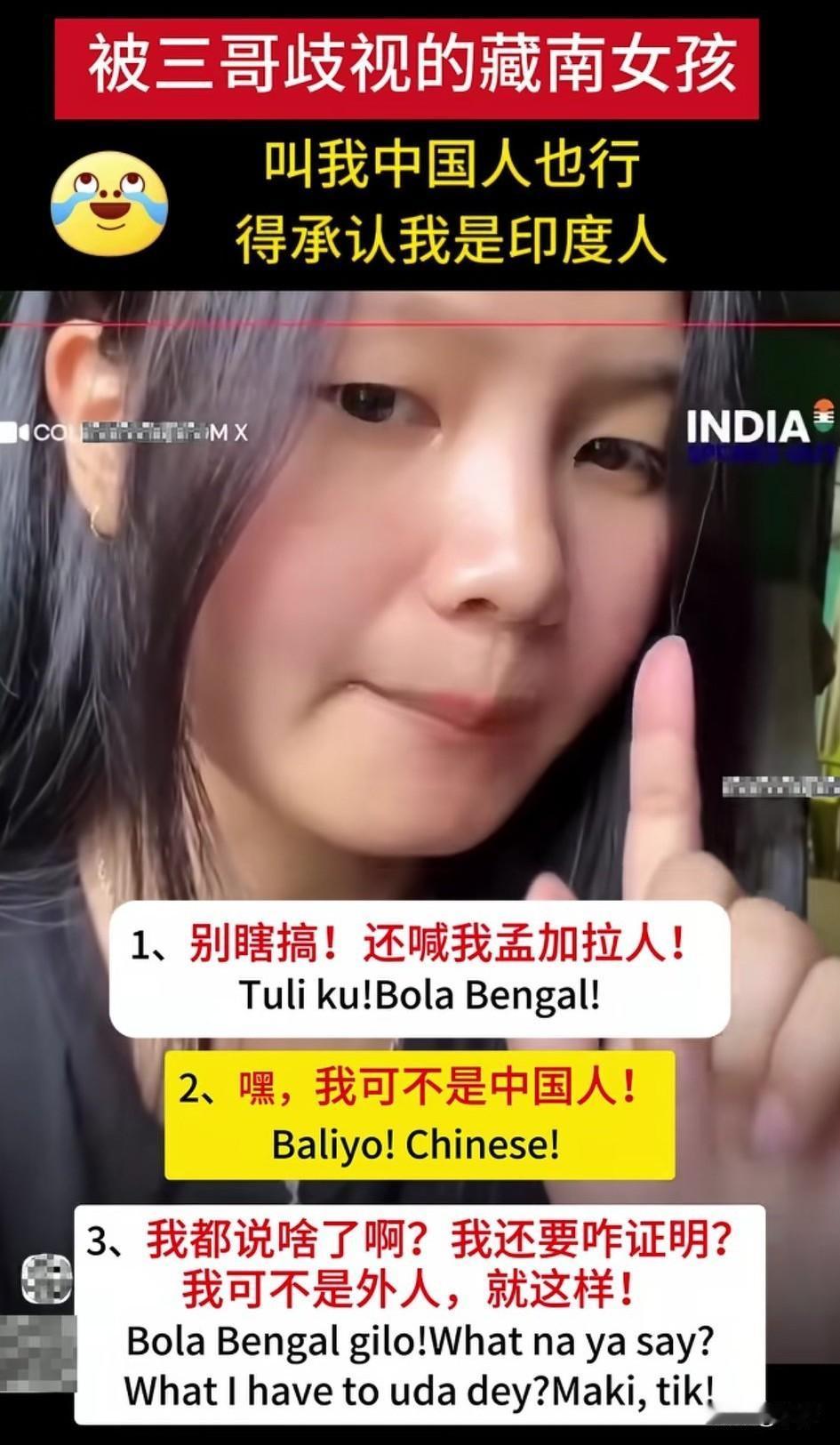 被三哥歧视的藏南女孩彻底火了, 她在视频中表示自己不是中国人, 请叫我印度人, 那表情和手势也是绝了, 明明长着一副中国面孔, 非要说自己是印度人, 藏南自古就是中国的领土, 这里的老百姓自然就是中国人, 这女孩居然在网上宣传这个, 她知不知道印度女性的地位, 印度女性都想离开印度, 这女孩还争着当印度人, 真不知道她咋想的, 真怀疑她的脑回路是不是正常的, 大家对于藏南女孩的惊天言论怎么看? 聊聊印度的故事 提到印度,你就会联想什么呢 藏南现状