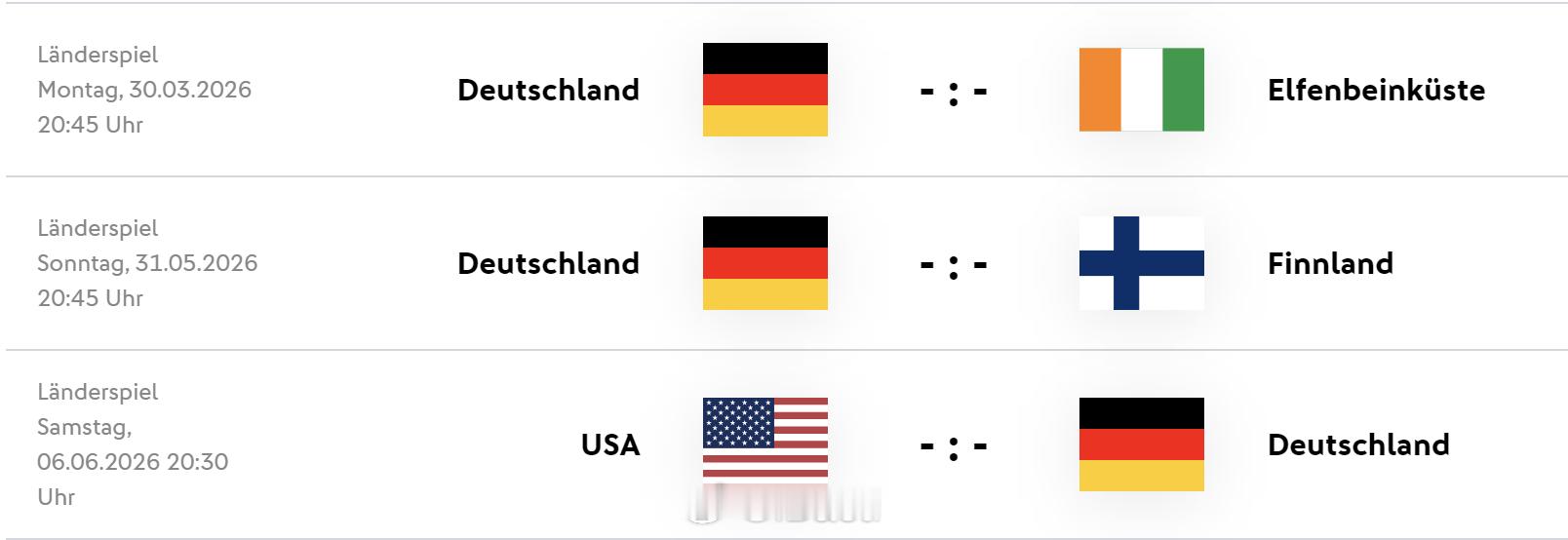 德国足协官宣,德国国家队将于明年6月6日在芝加哥军人球场和美国国家队进行一场友谊赛,也是世界杯前的最后一场热身赛,当地时间13点30分(德国时间20点30分),即北京时间7日凌晨2点30分开球。而在前往美国之前,德国队还将在5月31日坐镇美因茨迎战芬兰。明年3月国际比赛周两场友谊赛的安排是30日在斯图加特对科特迪瓦,而27日的对手将在周五的世界杯分组抽签结束后再选定。德国队世界杯