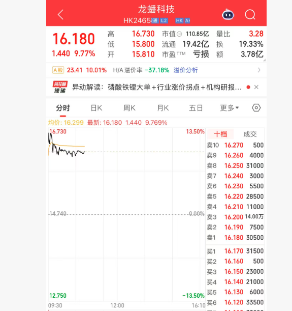 上证报中国证券网讯(记者李五强)12月3日,龙蟠科技H股开盘上涨,最高涨幅13.50%,截至10时49分,龙蟠科技报16.18港元/股,涨9.77%。