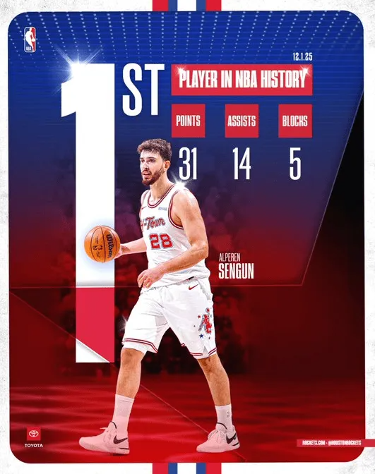 昨日NBA常规赛,火箭以125-133不敌爵士。 本场比赛,火箭球员阿尔佩伦-申京出战38分钟,19投12中,其中三分球3投1中,罚球8投6中,空砍31分8篮板14助攻2抢断5封盖。 今日,火箭官方晒出申京的海报:“申京是史上第一位至少得到30分14助攻5封盖的球员!”