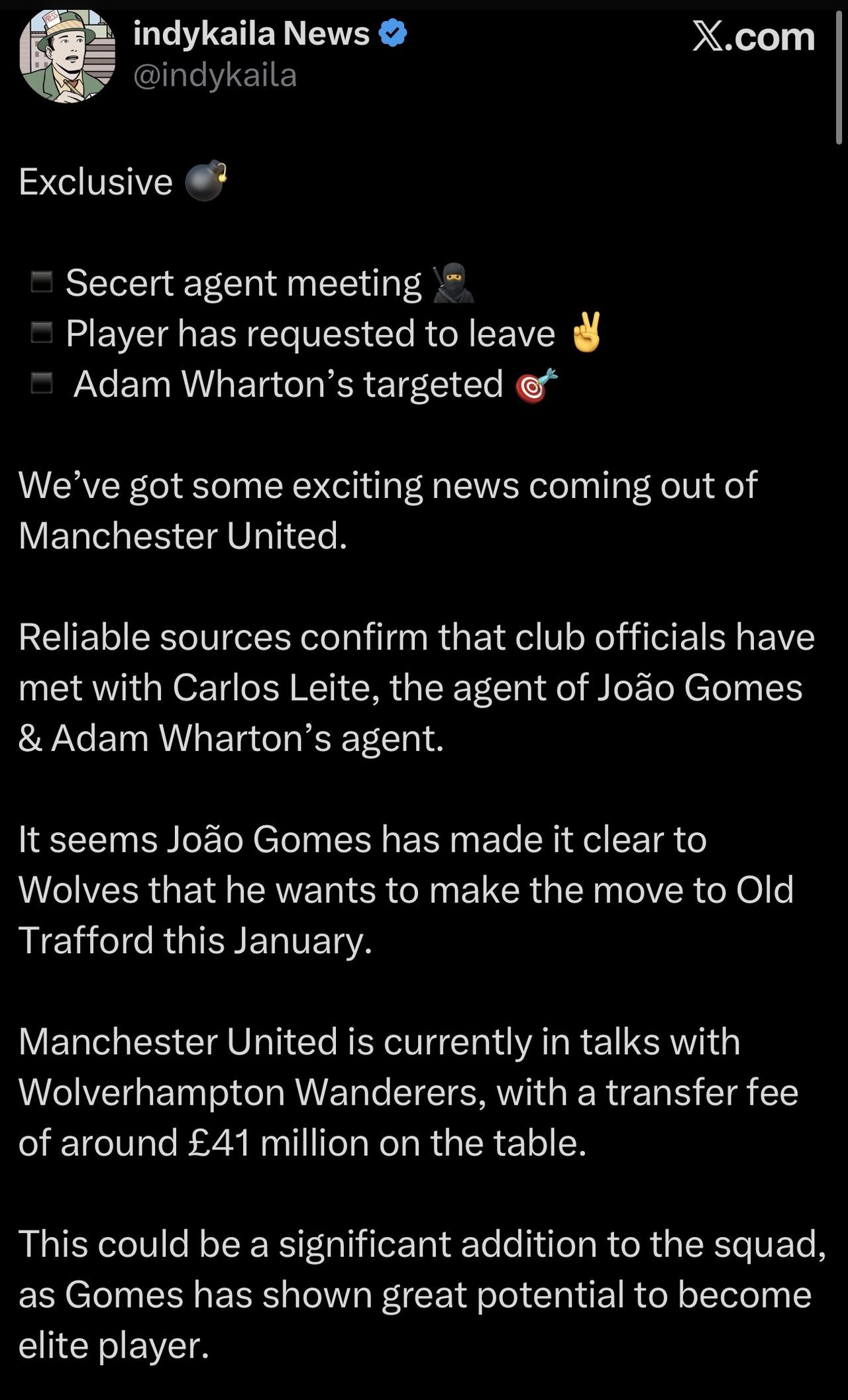 转发绿帽哥的消息,原文大家看图,简单说: 🔴戈麦斯:曼联已经谈的很深入了。 🔴沃顿也在考虑中了 🔴冬窗一定会有进和出[what] ………………………………………………………… 曼联方面有一些令人兴奋的消息要宣布。 可靠消息来源证实,俱乐部官员已经与若昂·戈麦斯的经纪人卡洛斯·莱特以及亚当·沃顿的经纪人会面。 看来若昂·戈麦斯已经向狼队明确表示,他希望在今年一月转会至老特拉福德。 曼联目前正在与狼队进行谈判,转会费约为 4100 万英镑。 这对于球队来说可能是一个重要的补充,因为戈麦斯展现出了成为精英球员的巨大潜力。