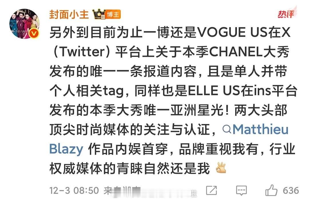 王一博是Vogue Us 今日发布的第一条香大秀报道内容,单人并带个人相关tag。还是ELLE US 在ins平台发布的本季大秀唯一亚洲星光!香奈儿大秀 王一博追星运王一博辛芷蕾聊啥呢