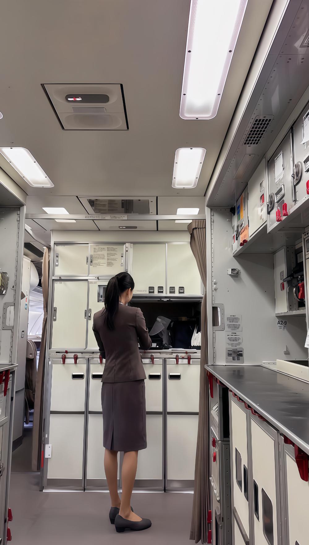 空姐在飞机厨房忙碌准备餐食,专业又优雅!