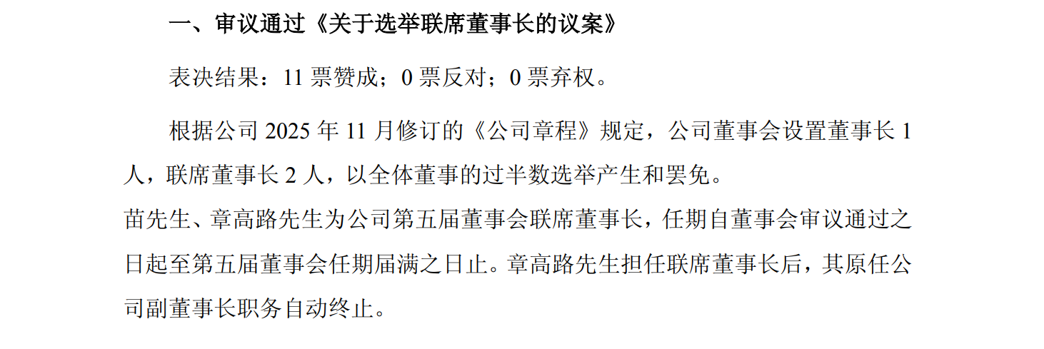 2025年11月29日,安井食品公告,选举张清苗和章高路为公司第五届董事会联席董事长,任期至本届董事会任期届满之日止。