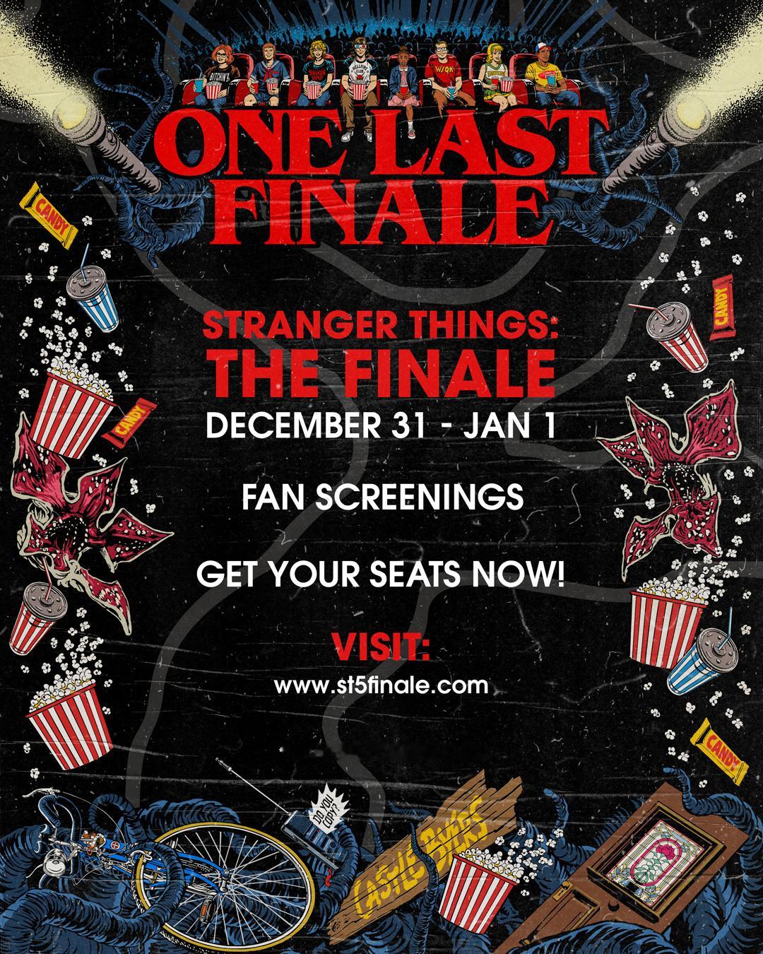 Netflix宣布 《怪奇物语》系列大结局将在美国和加拿大的500多家影院上映,官方确认时长为2小时5分钟。影院将出售入场券而非电影票,放映收入全部归影院所有。