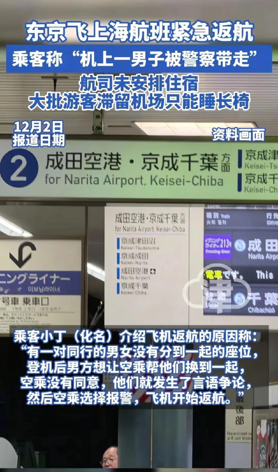 太自私了! 一架从东京飞往上海的飞机, 已经飞了快两个小时, 眼看都快到了, 竟然突然掉头返回了东京! 原因既不是天气不好,也不是机器故障,而是因为一对情侣在飞机上吵架导致大批旅客滞留机场只能睡长椅! 就因为座位没挨在一起,男方想免费换座被拒,就跟机组吵了俩小时,把机舱闹得鸡飞狗跳。机长可不是小题大做,机舱里的秩序直接关乎几百人的安危,真要是有人趁乱碰了关键设备,后果不堪设想。 最后闹事的被警察带走,可上百个无辜乘客倒了霉,深更半夜在机场睡长椅、躺地上,老人孩子遭罪不说,赶行程的损失更是没法算。454块补偿,连一晚酒店都不够,哪能弥补这份折腾? 公共空间里的“边界感”真不是空话,你的任性不能让别人买单。航空安全面前没小事,但遇到这种情况,除了返航就没更稳妥的处理方式吗?你觉得该怎么平衡规则和效率?来评论区聊聊~上海直飞日本 上海至东京航班 东京航班 东京飞浦东 东京飞纽约航班 新加坡飞东京 东京上海往返