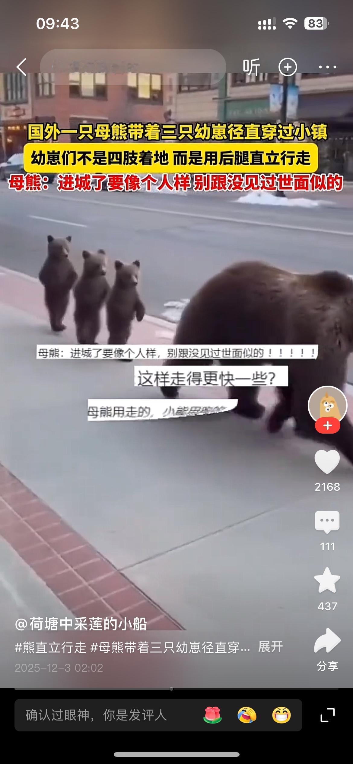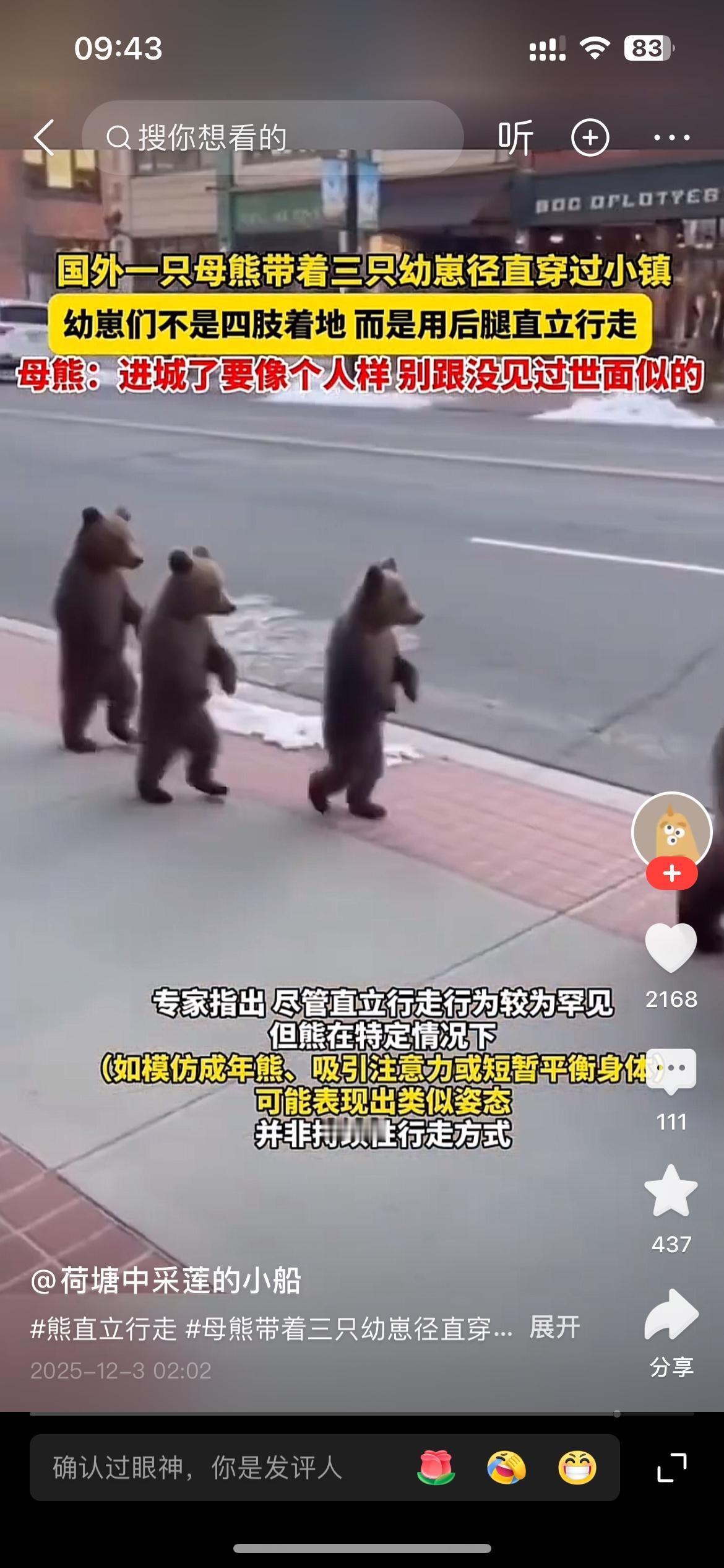 这三只小熊是要“成精”了,竟然站直起来,直立行走了,这猛眼一看,真像三个人在后面走路!真是大摇大摆地“熊人”过闹市! 美国阿斯彭小镇,一只母熊带着三只小熊大摇大摆地穿过城镇。 这“熊出没”的早晨有点吓人,万一和人迎头撞上,是吓破“人胆”还是吓破“熊胆”!