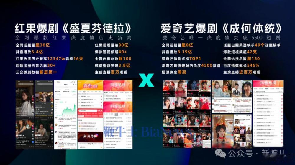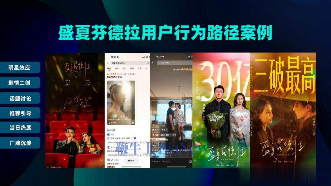 再看话题讨论度,最后热搜上得都不知道每天怎么冲上去的,30个以上的热搜都在榜上。当天的热度以及厂牌的沉淀,我们发现一个剧是否真正爆火,每个用户的路径都可以一一对应上。这是我截图,这些都是《盛夏芬德拉》的案例。