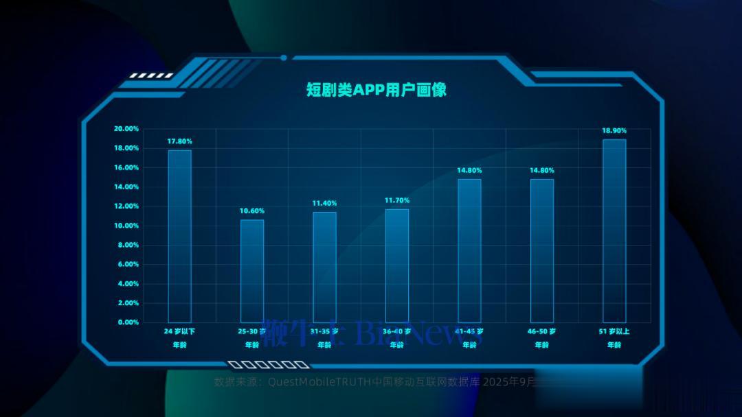 我们调研了全网用户,女性和男性的占比基本上是一致的状态。可能大家都认为女性多一些,但全网短剧,女性46.7%,男性53.4%。这是短剧用户的年龄画像,24岁以下数据非常高,归总到30岁以上的数据,发现这部分才能最大、最无敌的数据。如果拆开看,24岁以下也是非常重要的数据,这就是为什么漫剧这么受欢迎的核心原因。