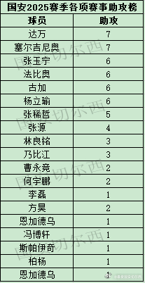 【国安2025赛季足协杯助攻及历史助攻的球员】 国安本赛季足协杯已经完成11次助攻,在2002赛季后单赛季完成助攻第二多,仅少于2018赛季的12次。本赛季足协杯中,塞尔吉尼奥完成3次助攻,全队最多,张玉宁完成2次。历史单赛季在足协杯完成助攻最多的是陶伟、张稀哲和比埃拉,各完成3次。2002赛季后,在足协杯完成助攻最多的是张稀哲,完成10次。陶伟完成6次排在第二位。在本赛季各项赛事中,塞尔吉尼奥和达万各完成7次助攻,全队最多。另外法比奥、古加、张玉宁和杨立瑜各完成6次,张稀哲完成5次。这几人都有可能成为球队本赛季各项赛事完成助攻最多的球员。